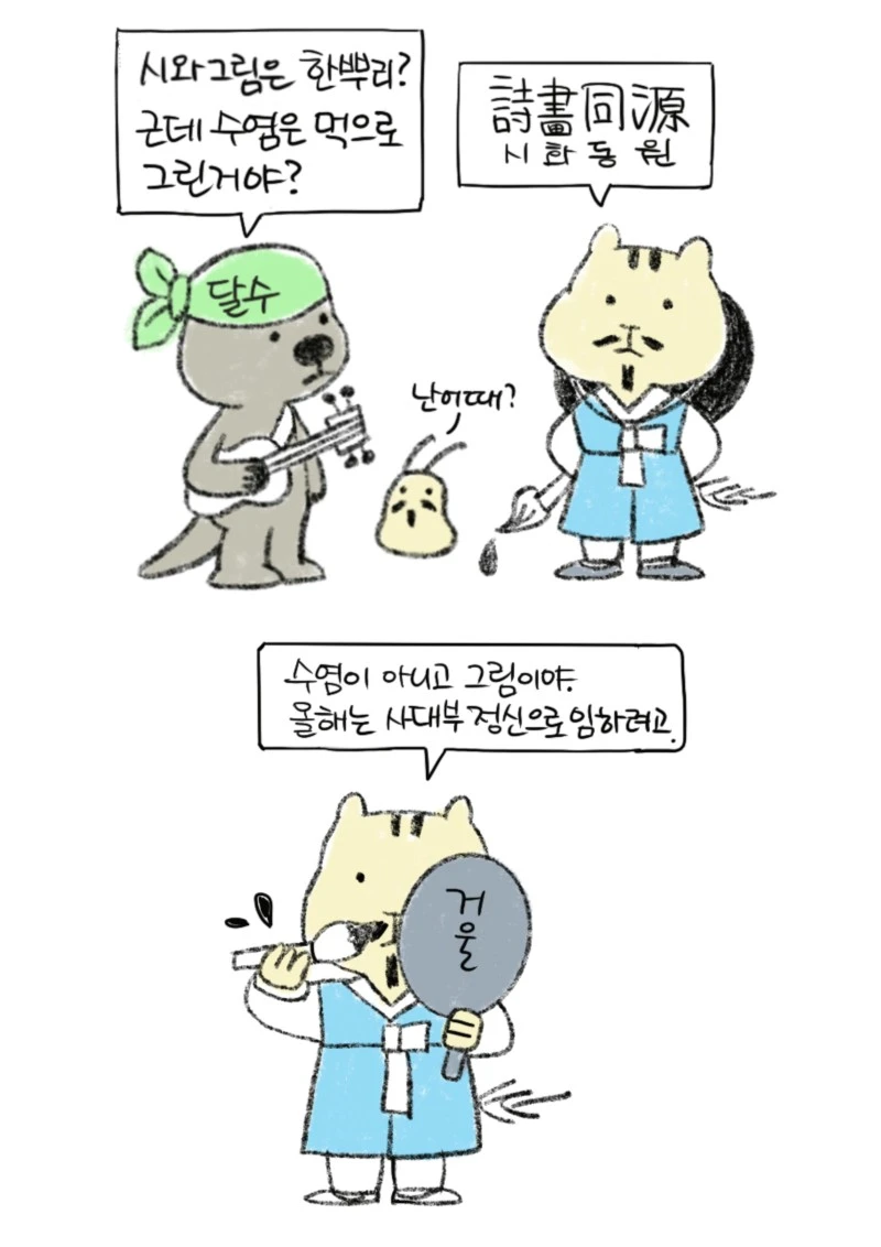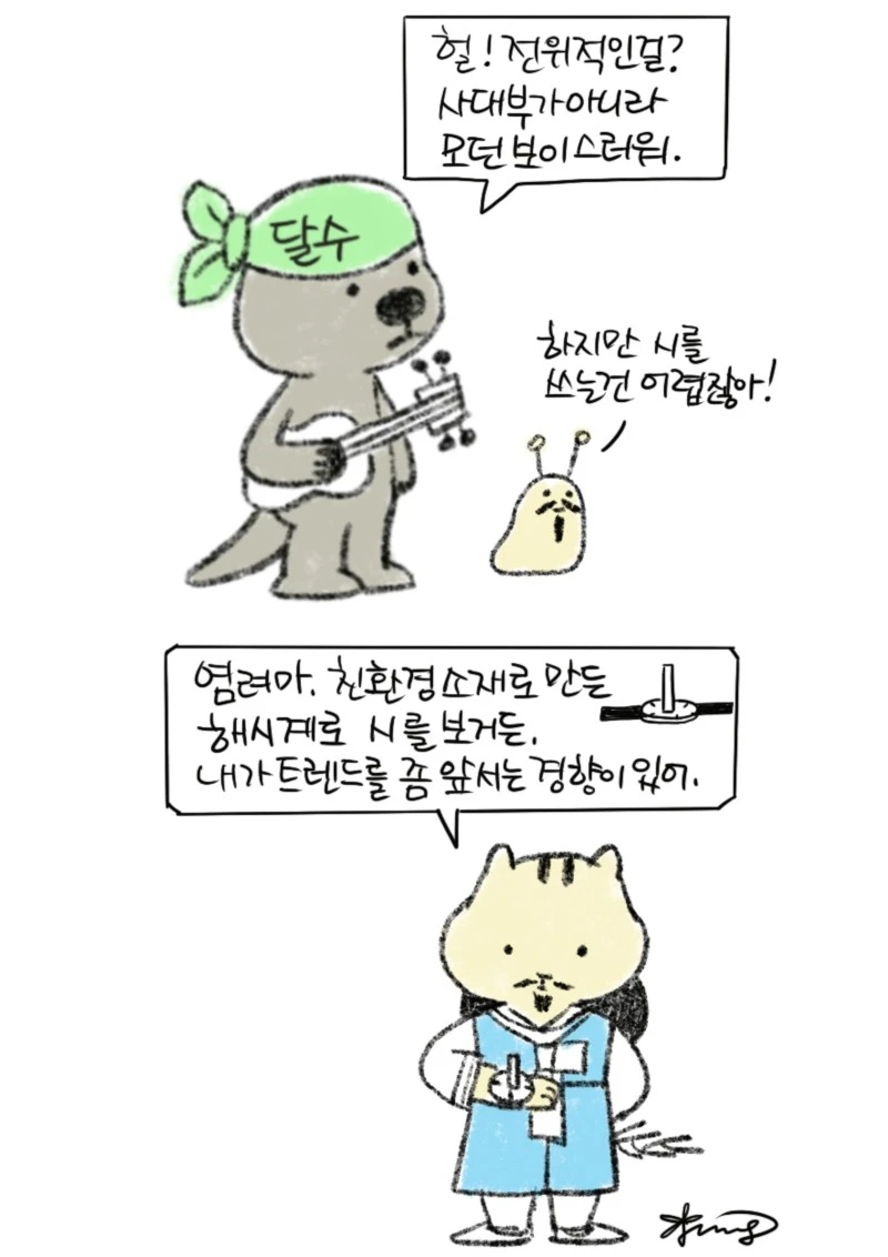「다람이와 달수」 그립니다. 다람이는 다람쥐, 달수는 수달이고 농담속 한줄 인문학을 컨셉으로 그리는 만화 입니다.