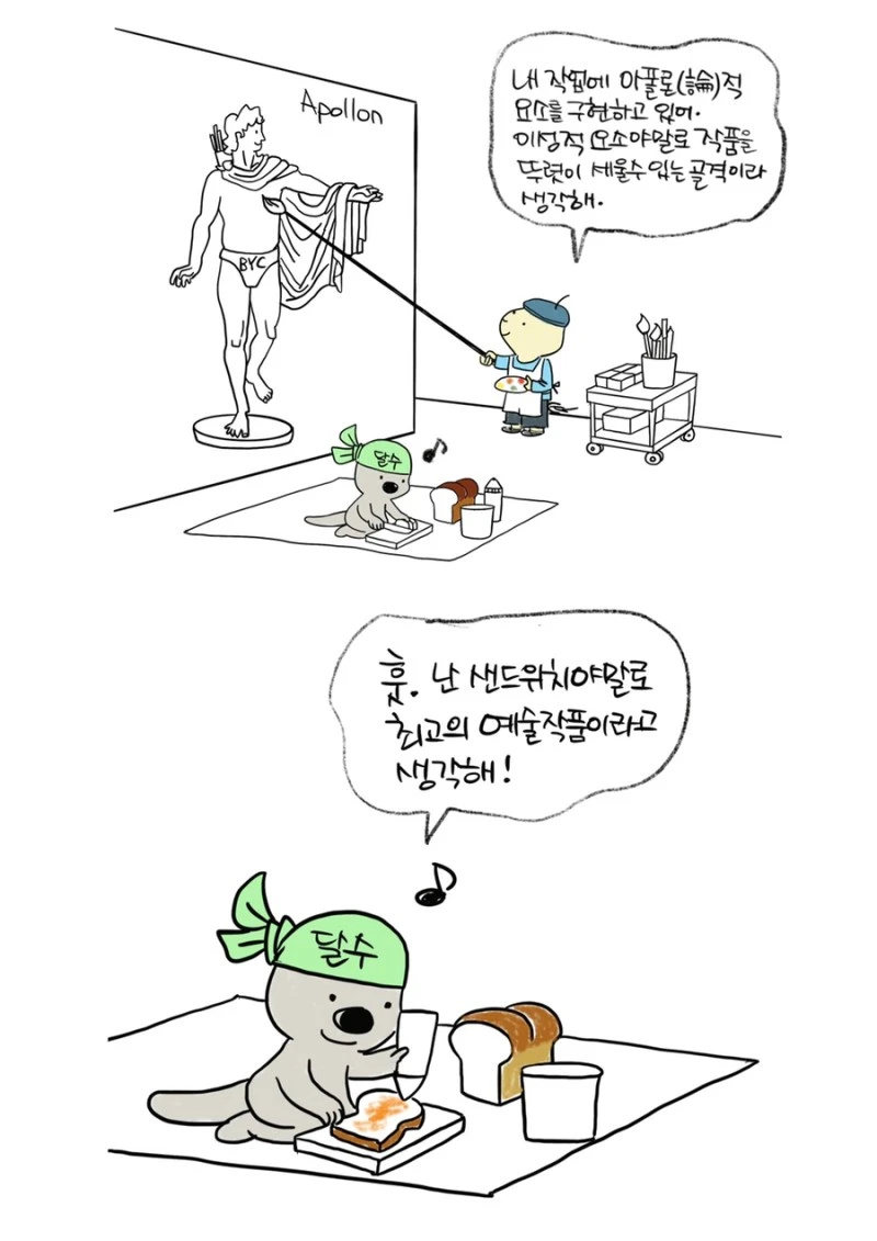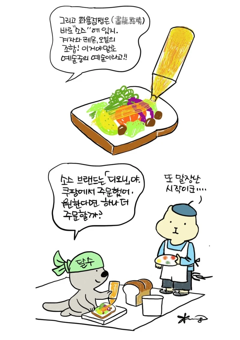 「다람이와 달수」 그립니다. 다람이는 다람쥐, 달수는 수달이고 농담속 한줄 인문학을 컨셉으로 그리는 만화 입니다.