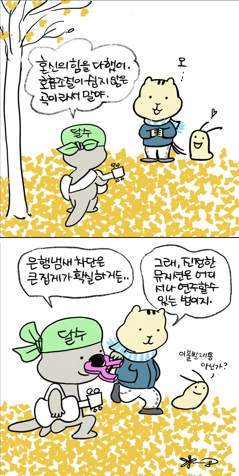 「다람이와 달수」 그립니다. 다람이는 다람쥐, 달수는 수달이고 농담속 한줄 인문학을 컨셉으로 그리는 만화 입니다.