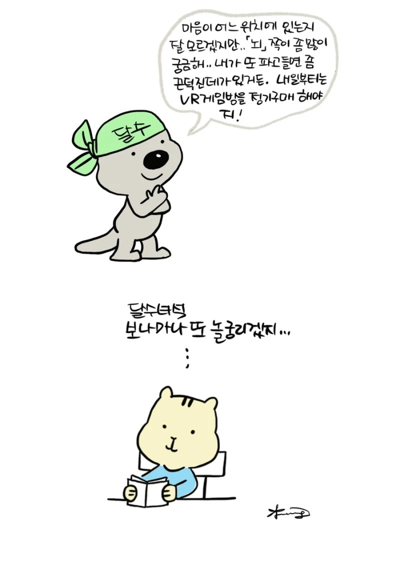 「다람이와 달수」 그립니다. 다람이는 다람쥐, 달수는 수달이고 농담속 한줄 인문학을 컨셉으로 그리는 만화 입니다.