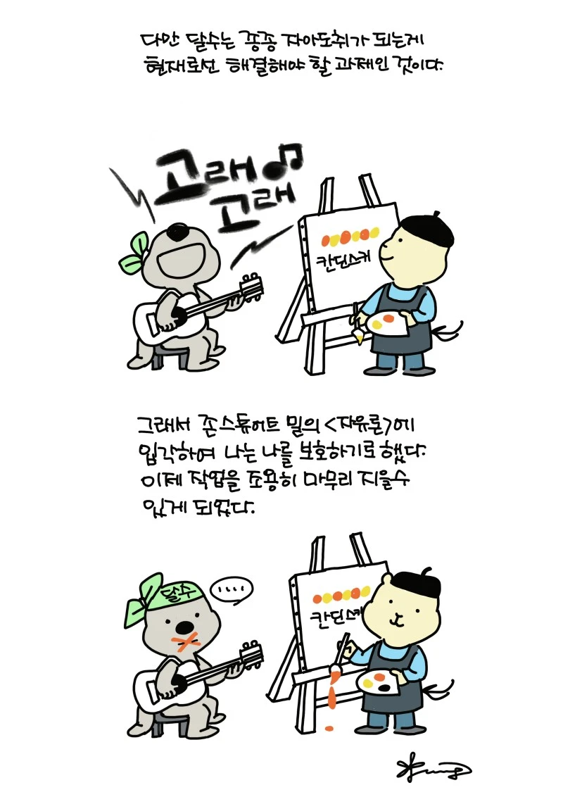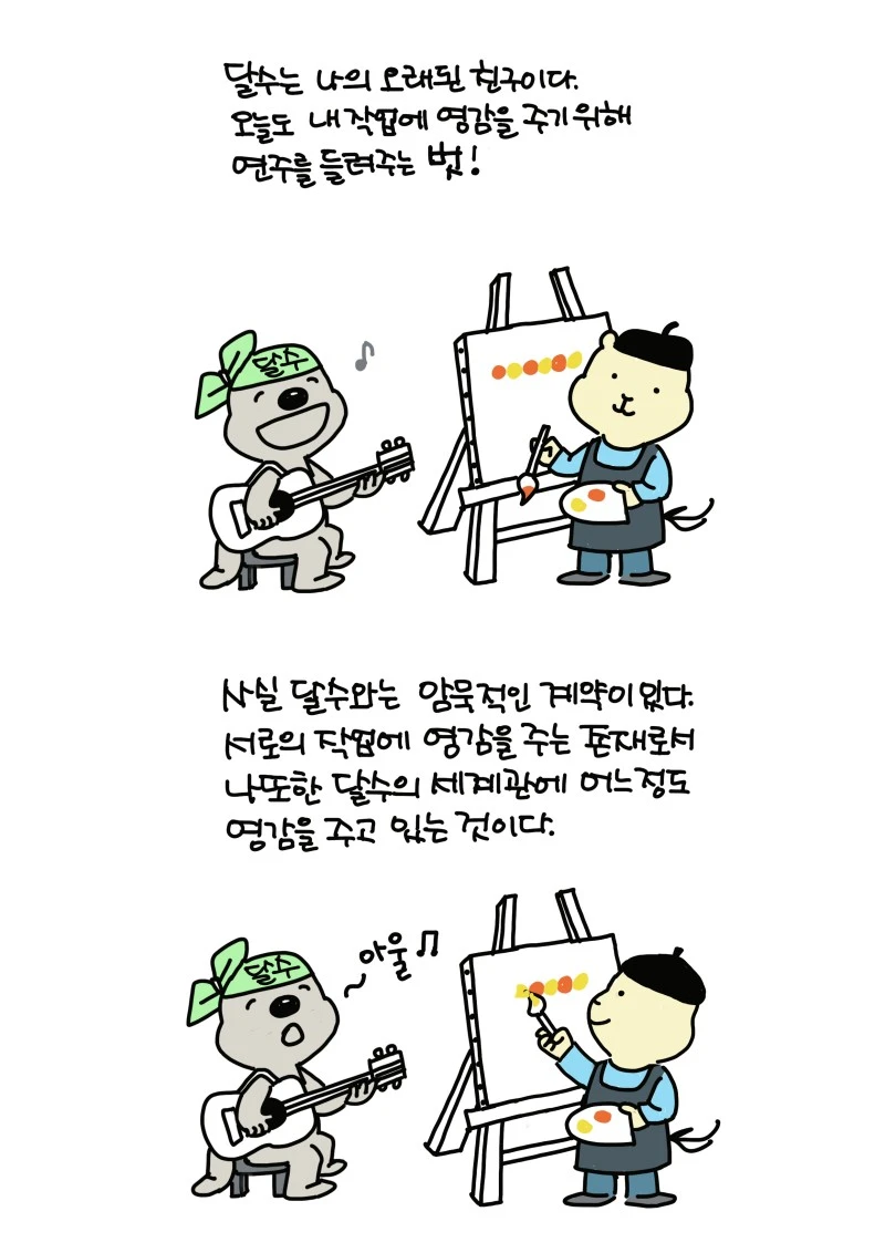 「다람이와 달수」 그립니다. 다람이는 다람쥐, 달수는 수달이고 농담속 한줄 인문학을 컨셉으로 그리는 만화 입니다.