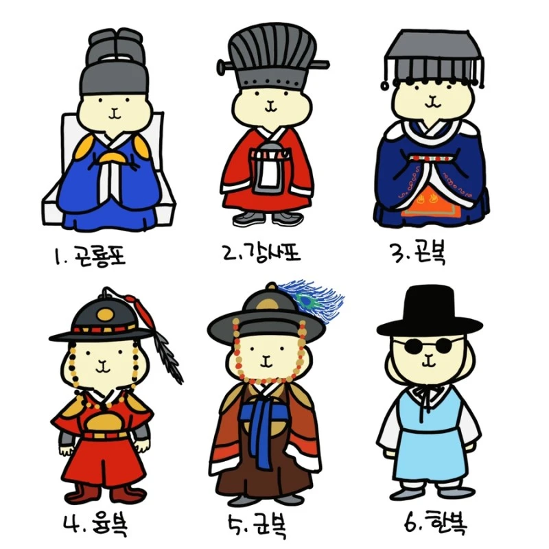 조선시대 왕의 의복은 크게 위의 그림처럼 다섯 가지로 나뉘는데,