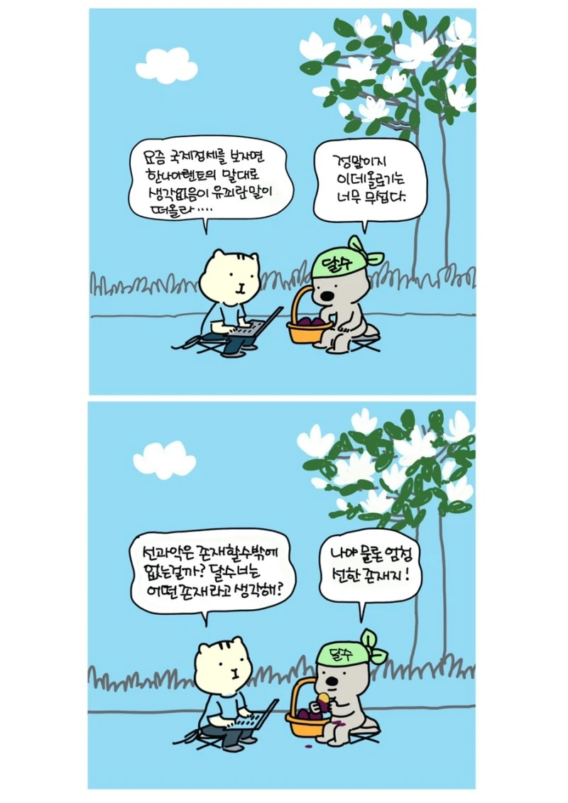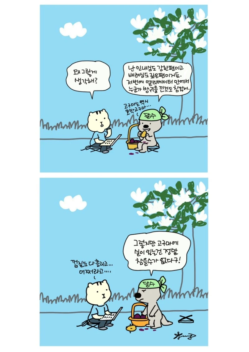 「다람이와 달수」 그립니다. 다람이는 다람쥐, 달수는 수달이고 농담속 한줄 인문학을 컨셉으로 그리는 만화 입니다.