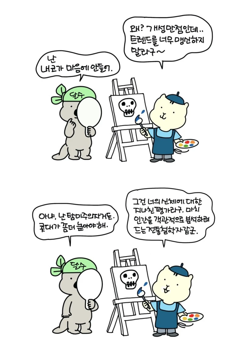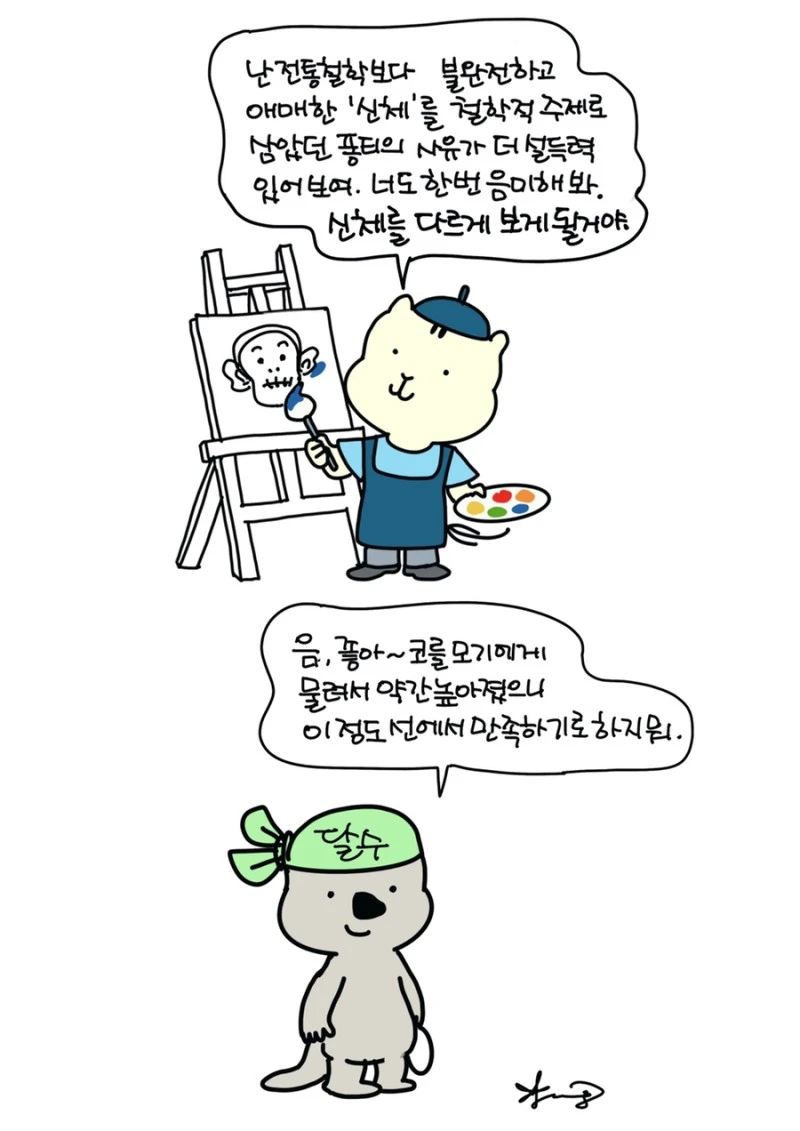 「다람이와 달수」 그립니다. 다람이는 다람쥐, 달수는 수달이고 농담속 한줄 인문학을 컨셉으로 그리는 만화 입니다.