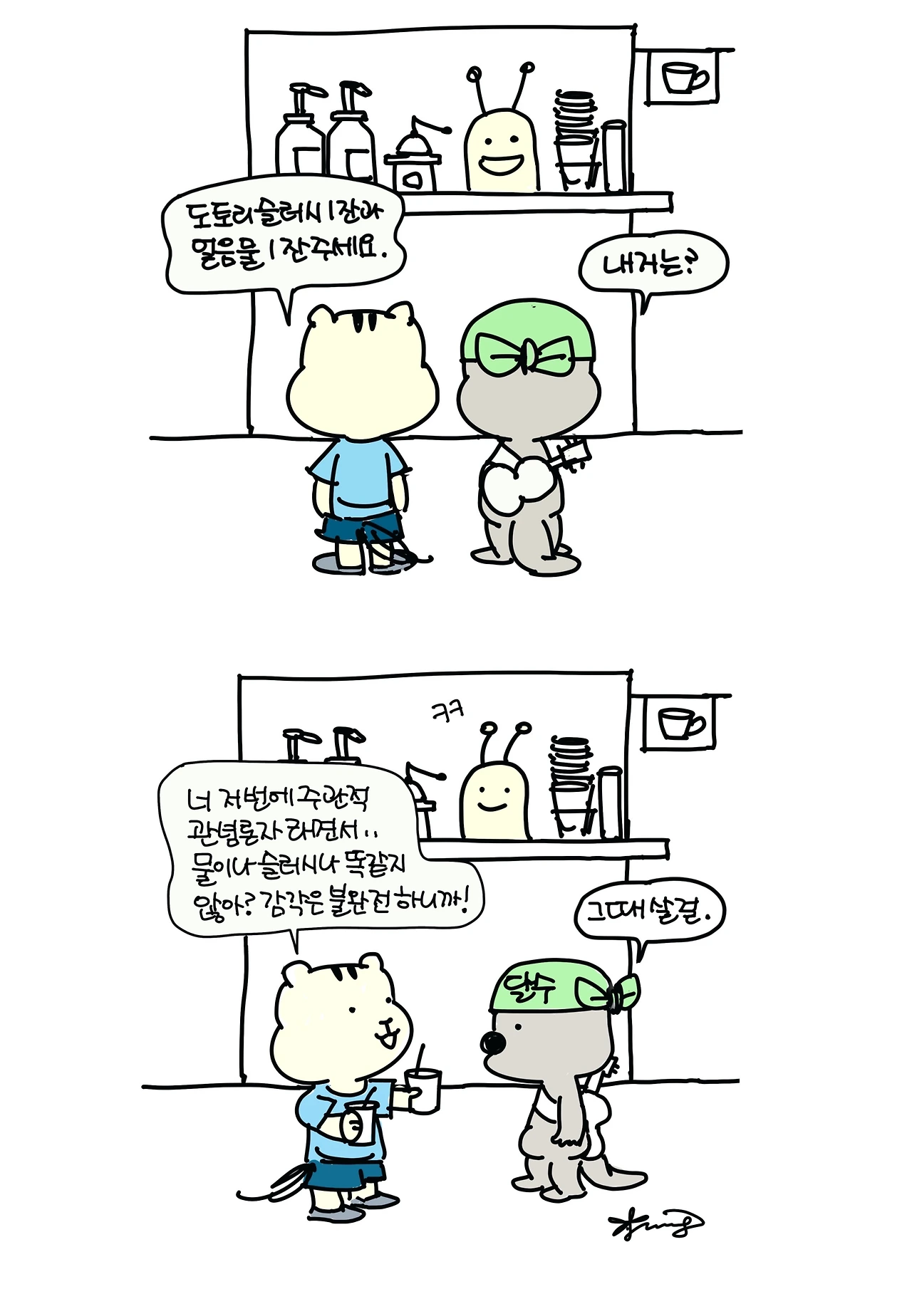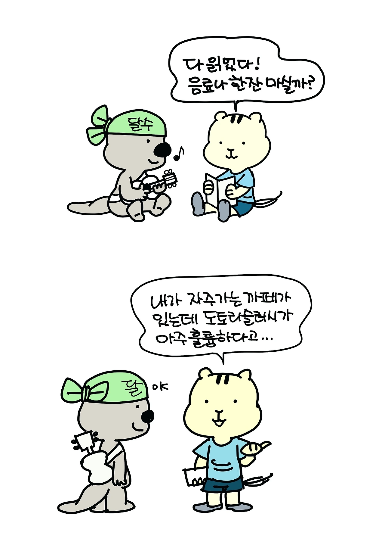 「다람이와 달수」 그립니다. 다람이는 다람쥐, 달수는 수달이고 농담속 한줄 인문학을 컨셉으로 그리는 만화 입니다.