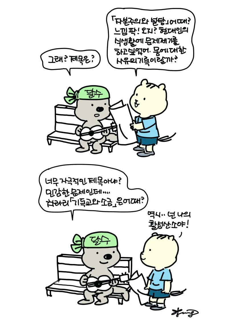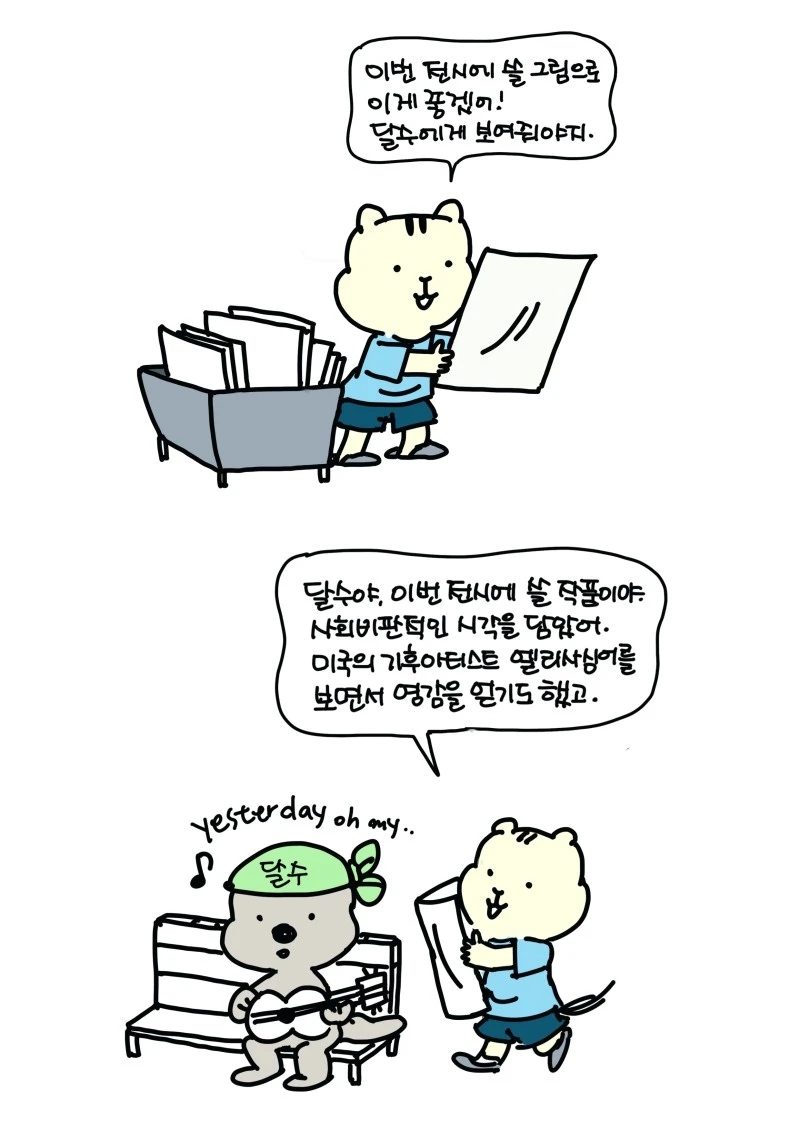 「다람이와 달수」 그립니다. 다람이는 다람쥐, 달수는 수달이고 농담속 한줄 인문학을 컨셉으로 그리는 만화 입니다.