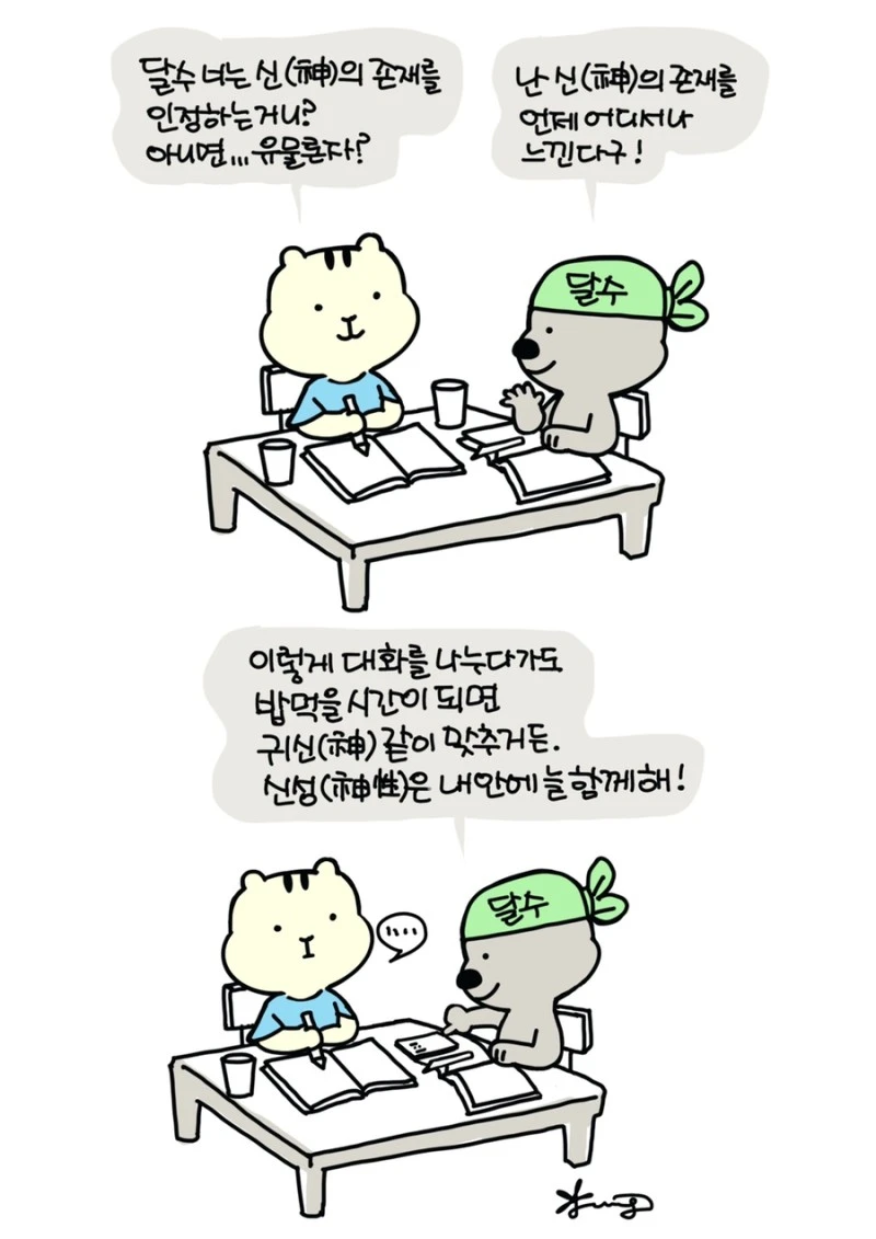 「다람이와 달수」 그립니다. 다람이는 다람쥐, 달수는 수달이고 농담속 한줄 인문학을 컨셉으로 그리는 만화 입니다.