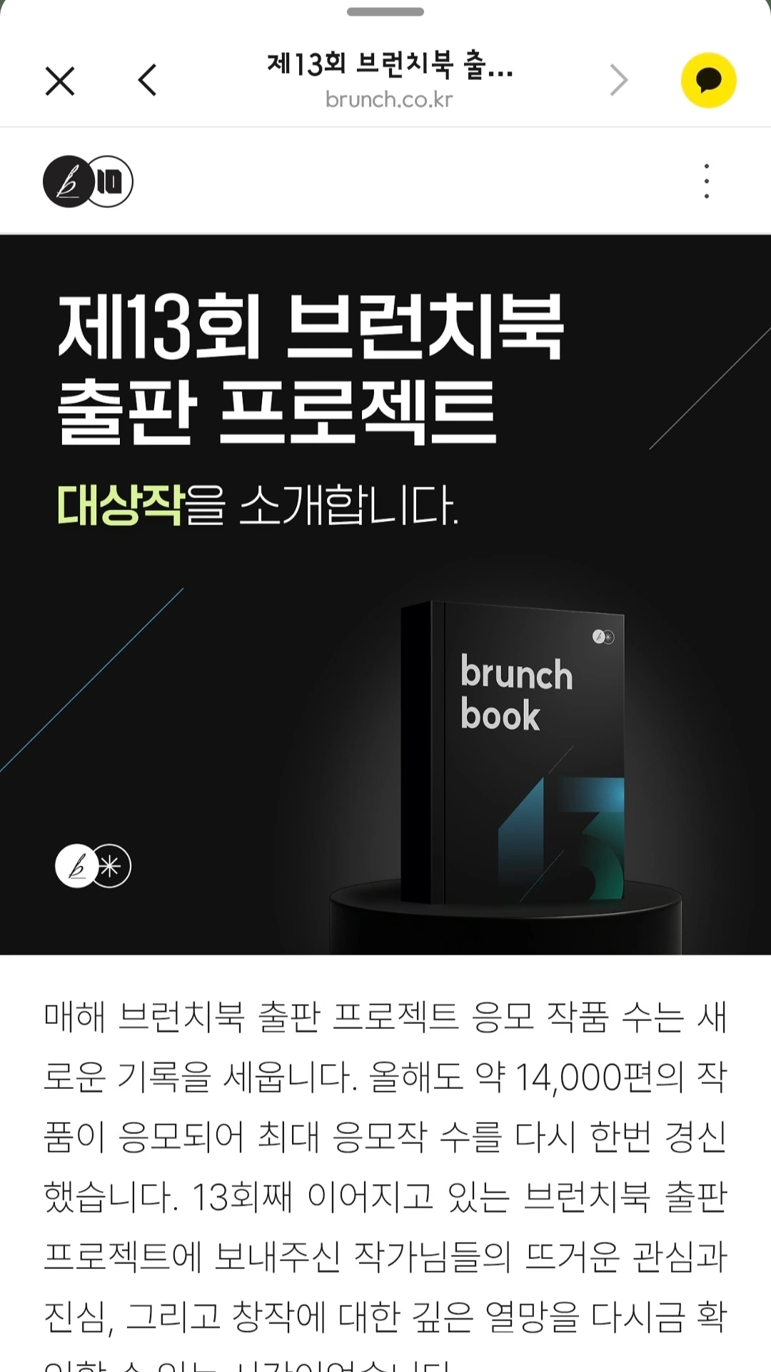 올해 10월에 마감된 제13회 브런치북 출판 프로젝트 수상 작품 발표 안내였다.