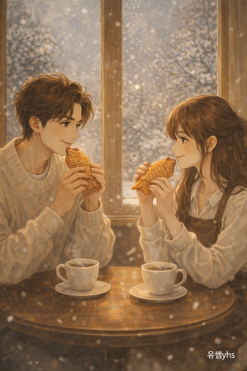 함께 붕어빵을 나눠 먹는 두 사람 사이에