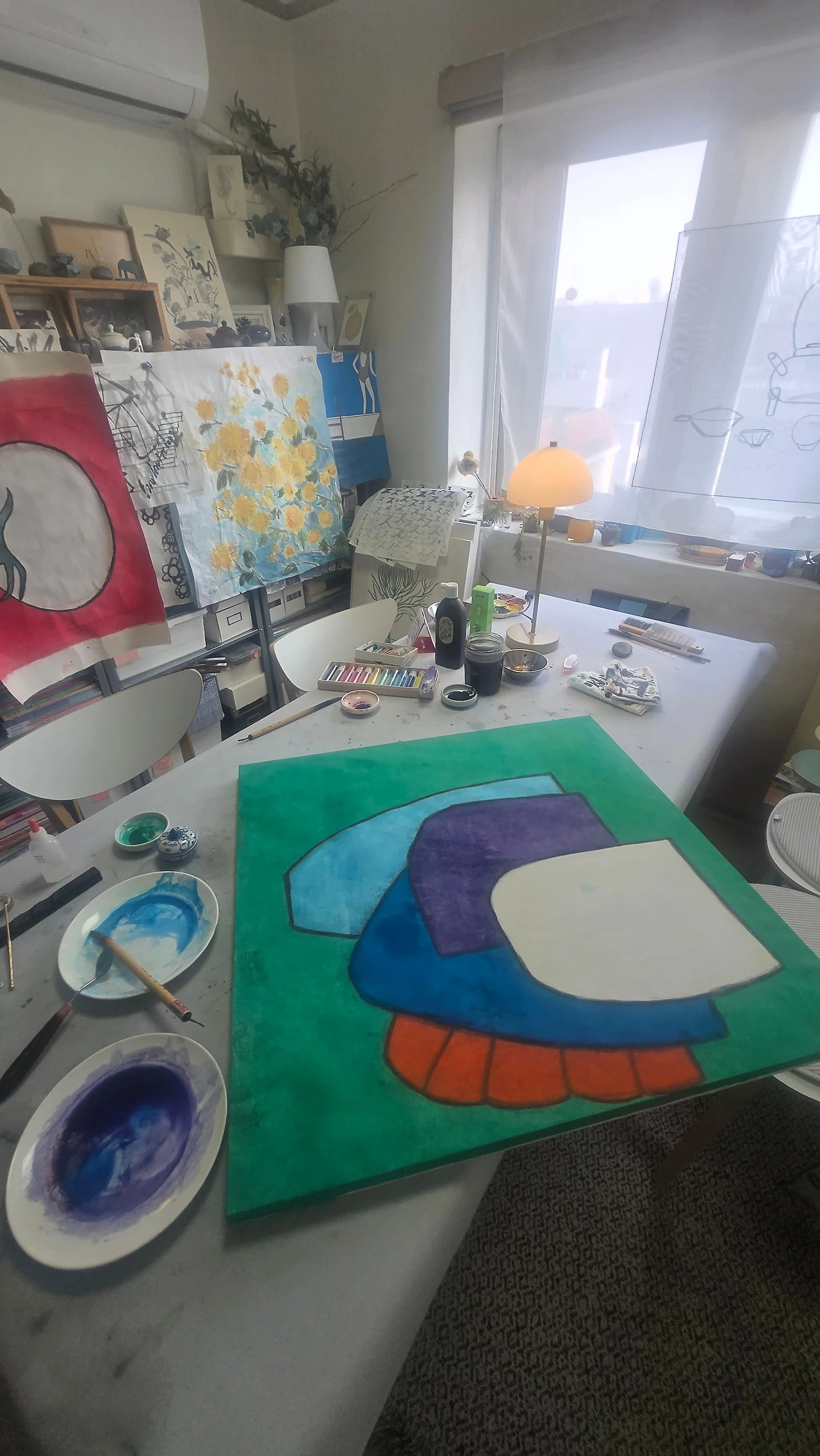 선생님은 이 공간을 늘 “누추하다”라고 말하지만, 내게는 그렇지 않다. 큰 창으로 스며드는 햇살과 길게 드리운 그림자, 그 안에서 천천히 말라가는 물감들까지.