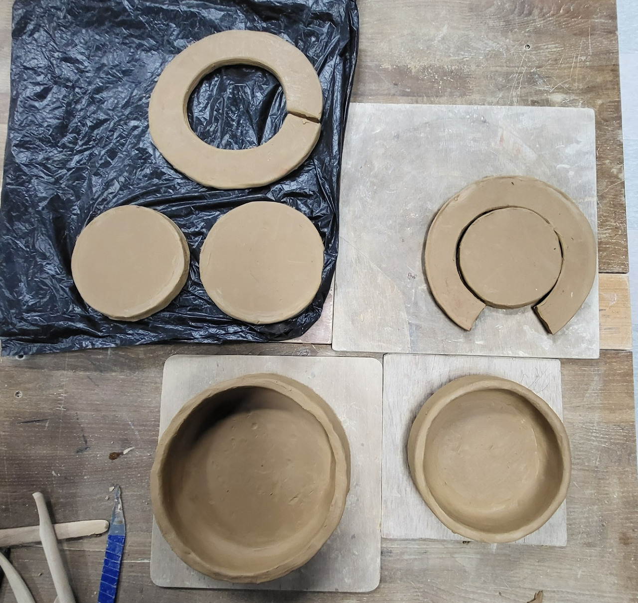 네...? 제가요...? 제가 운동을 즐겨해서 체력이 좋긴 한데 두 시간 동안 이렇게 많을 걸 가르쳐주신다고요...? 그래도 하고 싶던 도예 클래스고, 오늘 안 하면 다음 주까지 기다렸다 이어서 해야 하는 건 또 싫었다. 선생님의 지시에 따라 두 개는 만들어 놓은 원형 판을 잘라 붙이고, 세 개는 코일링 기법으로 만들어 놓은 판에 벽을 우기로 했다.