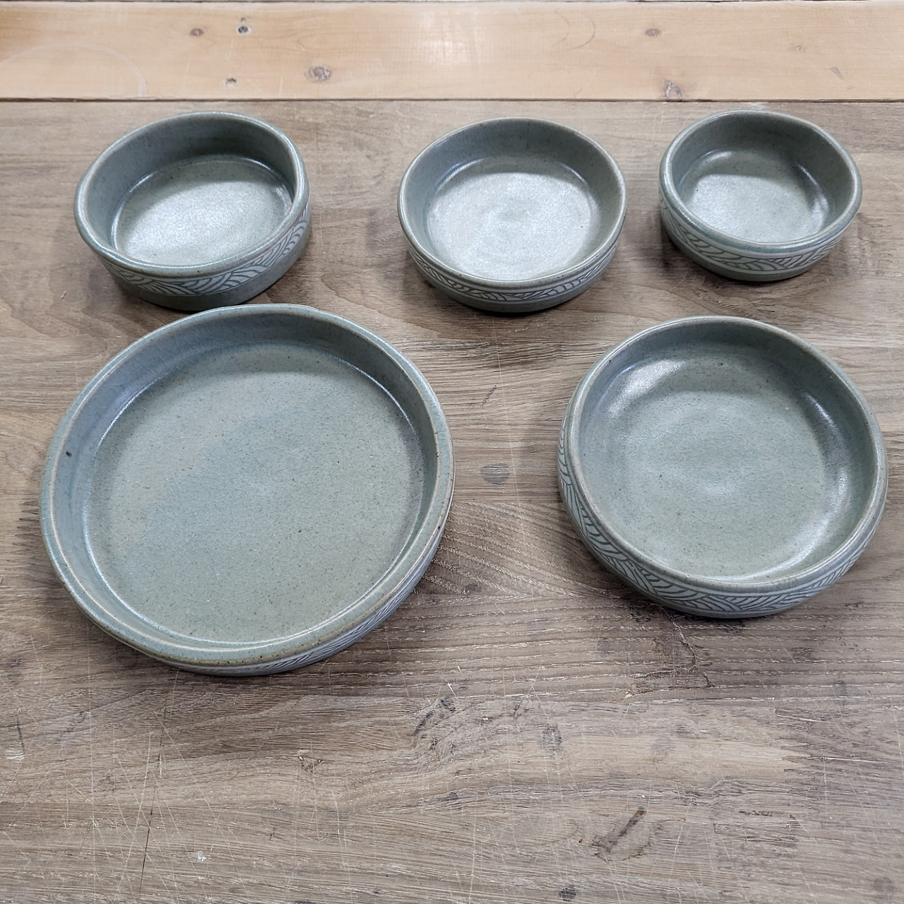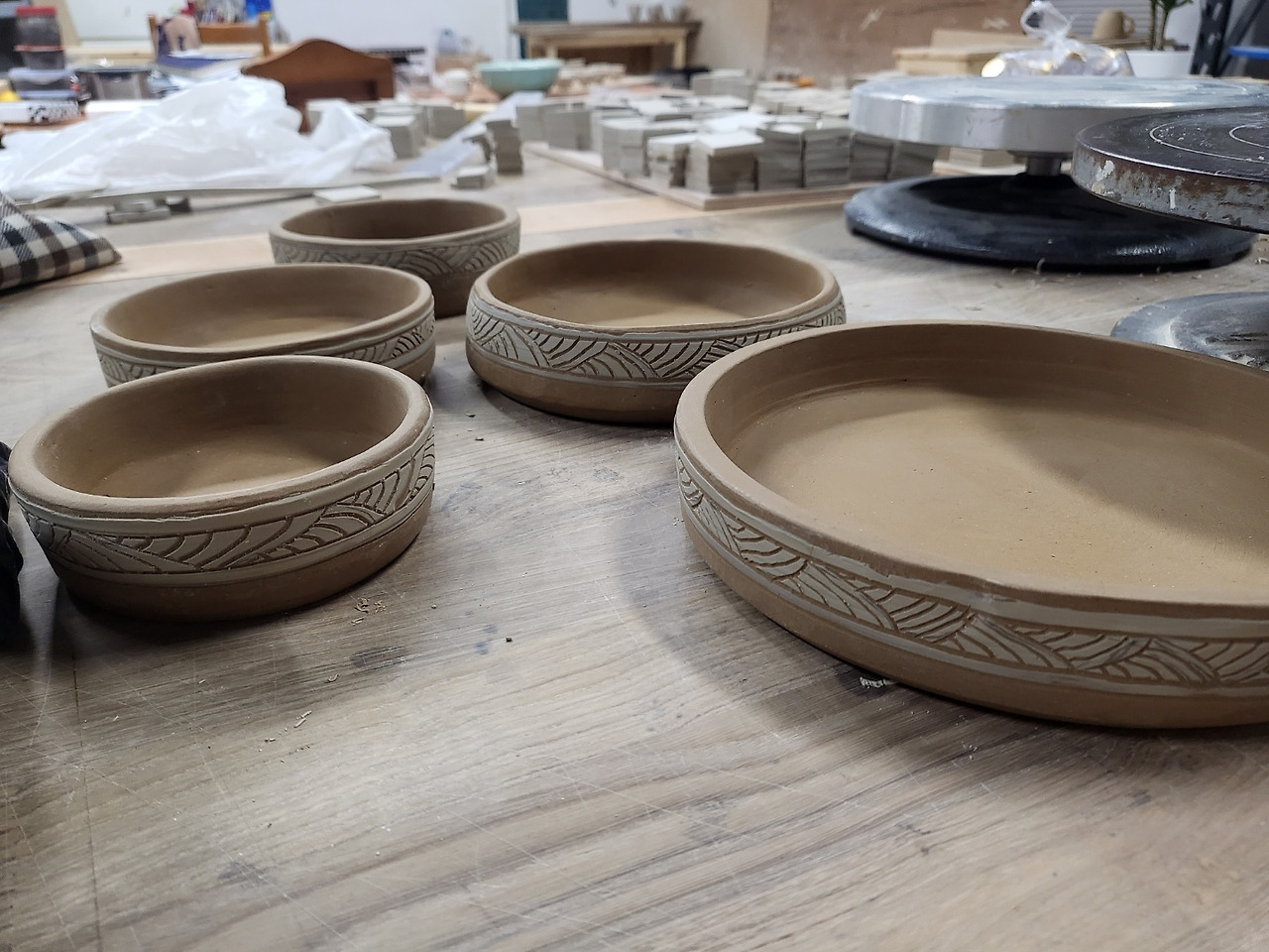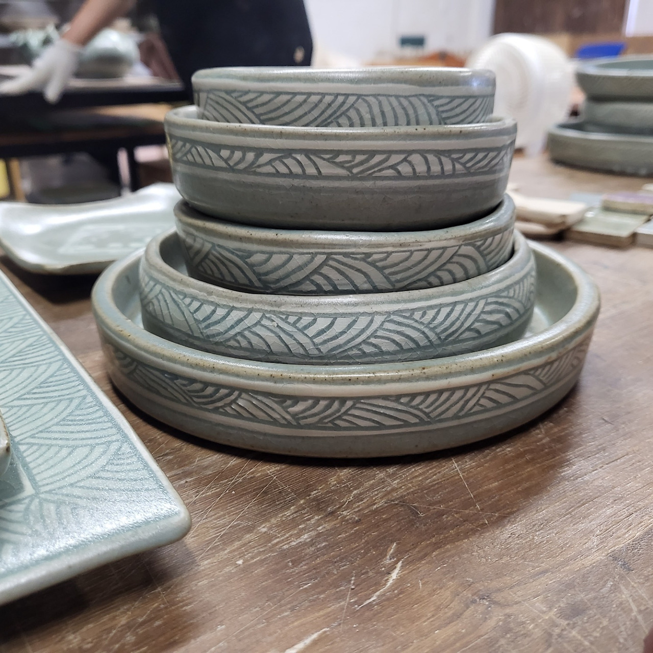 그렇게 그 주 꼬박 4시간을 5개의 원형 그릇에 무늬를 새기느라 다 써버렸다. 쓱쓱 조각도로 긁기만 하는 데도 하나만 끝내도 시간이 훌쩍 지나가 있었다. 아직 도구도, 기술도 손에 익지 않아서 그런 모양이다. 이틀 동안 허리와 목, 눈까지 혹사시켜 그릇을 어찌어찌 완성했다.