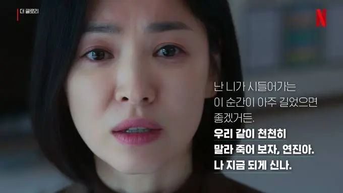 이런 아이들이 자기중심적 사고를 버리고 정도를 걷게 만드는 것이 어른들의 몫일 것이다.그런 의미에서 <더 글로리>는 더 이상의 연진, 사라, 재진, 명오 같은 아이들을 만들지 말자고 말한다.