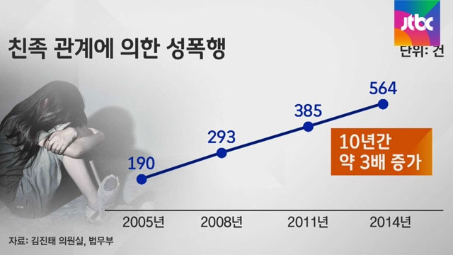 앞서 보여드린 표에서 보셨듯이, ‘친족 성범죄’의 가해자 3할 이상이 ‘친아버지’입니다. 항렬 상 위에 있고, 경제적으로 우위에 있는 사람에게서 성폭행을 당하면 일반적인 성폭행보다 이에 대해 대응하기 어렵습니다.