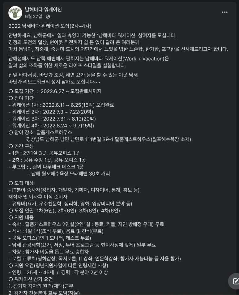 얼마 전에 여름 시즌을 맞이해서 기업 혹은 지자체에서 워케이션 제도를 진행하고 있다는 뉴스를 접하기도 했어서 빠르게 찾아보면 지원할 수 있는 공고가 있겠다는 판단을 했고요. 그 결과! 제가 원하는 기간에 남해에서 워케이션 참가자를 모집한다는 공고를 발견하여, 지원서를 바로 작성했지요.