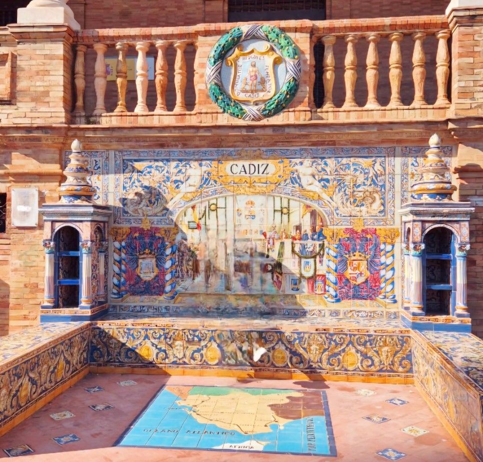 출입구 가까이에 있던 타일의자에 눈길이 갔다. (CADIZ) 카디스라는 표기가 있었다. 카디스는 안달 루시아 지방 남부의 대서양과 마주한 해안도시였다. 세비아에서 멀지 곳에 위치하고 있었고, 이곳을 바이런이 "대양의 인어"라고 했다고 한다. 포에니전쟁, 신대륙 발견등 역사적 의미를 담고 있는 곳이었다.