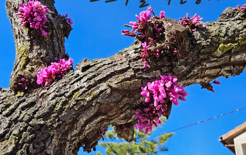 휴게실을 나와 투어 버스가 기다리고 있는 길목으로 걸음을 옮겼다. 길 모퉁이 사이에 서 있는 굵은 나무엔 보랏빛 꽃 봉오리가 보였다. 쌀쌀한 기온에도 나무를 뚫고 나온 박태기꽃을 보는 순간 나도 모르게 감탄사가 나왔다. 움을 틔운 꽃은 짙은 청보라색 봉우리로 빼곡하게 달려 있었고 이때, 호기심으로 더 가까이 다가갔다. 자세히 보니 청 보라색 꽃 위엔 물방울이 앉아 있었다. 둥근 구슬 같은 물방울을 품고 있는 박태기 꽃이 새삼스레 사랑스러웠다. 포르투갈에서 본 박태기꽃.....