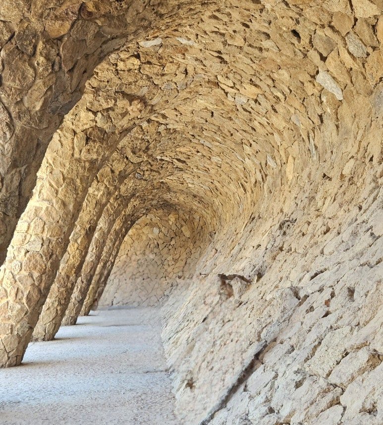 길 따라 걸음을 옮기는 중 사람들이 사진을 찍는 모습이 보였다. 그곳은 특이하게 돌조각으로 동굴을 만든 것 같았다. 돌을 붙인 기둥은 비스듬하게 기울어져 언덕을 받치고 있는 모습이 특이했다. 이 기둥은 가우디가 의도적으로 설계한 작품이지만 놀랍게도 전체적으로 안정감을 주었다. 동생과 나도 동굴벽을 기대어 사진을 찍었다.