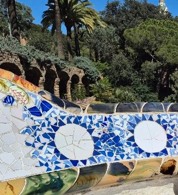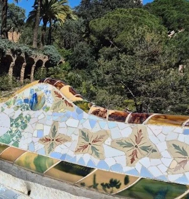 구엘공원 또 다른 특징적인 것으로는, 휴식의 공간인 광장벤치 군데군데는 '트렌 카디스' 기법인 조각난 타일을 붙여 만든 문양이 눈에 들어왔다. 어느 한 곳에는 푸른 타일 조각으로 꾸민 문양의 형태가 해바라기 또는 태양으로 보였고, 다양한 색 타일과 문양으로 만든 독특한 벤치가 눈길을 끌었다.