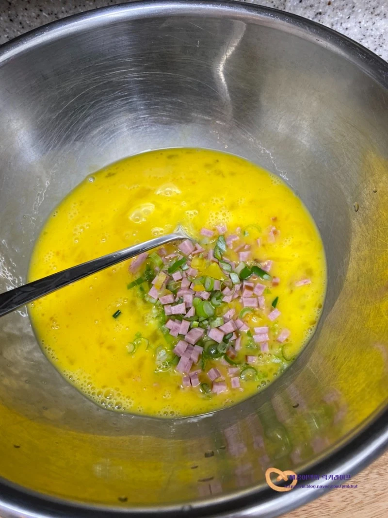 잘게 다진 채소와 햄을 넣고 충분히 섞어 주세요 :)