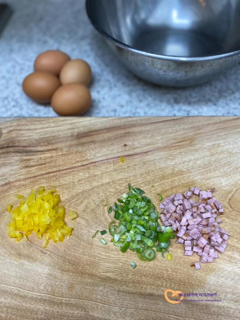파프리카, 대파, 햄을 잘게 썰어서 준비해 주세요 :)