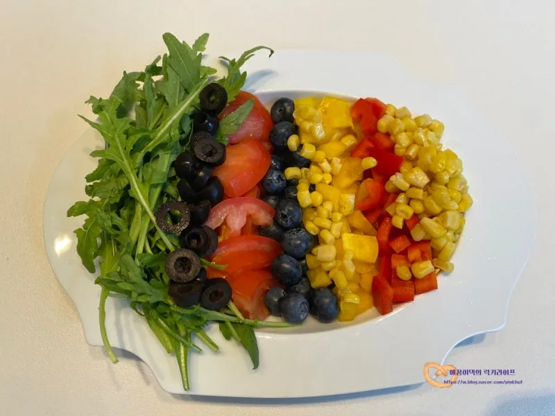 옥수수콘, 블루베리, 올리브를 썰어서 올렸어요