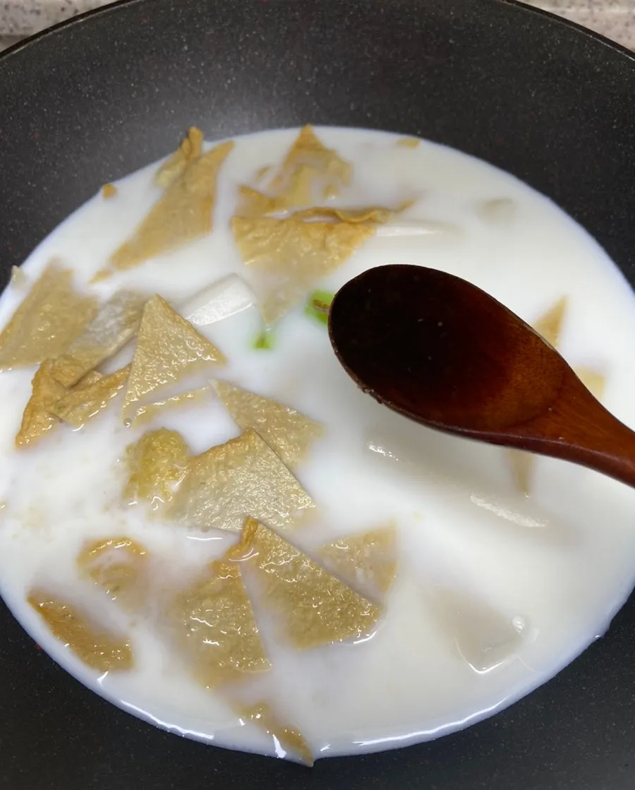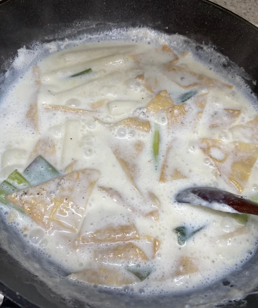 이어서 우유 400ml, 참치액 1T 를 넣고,
