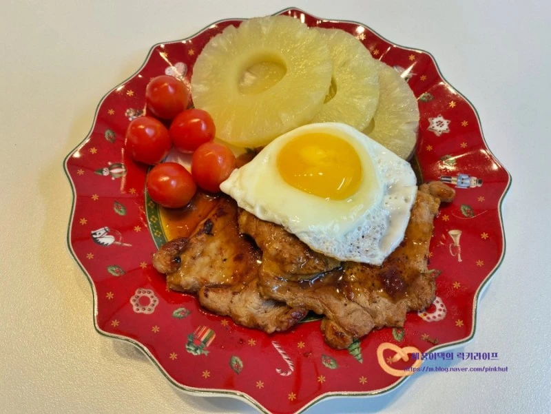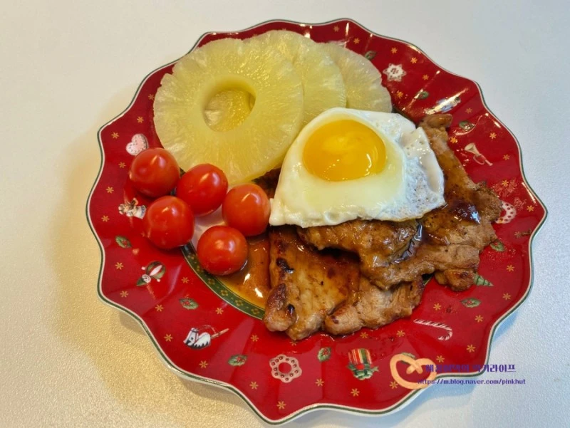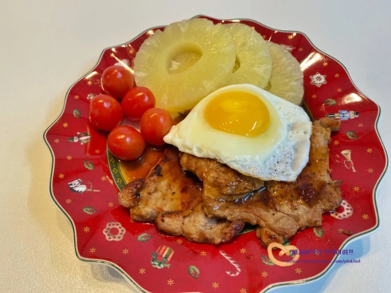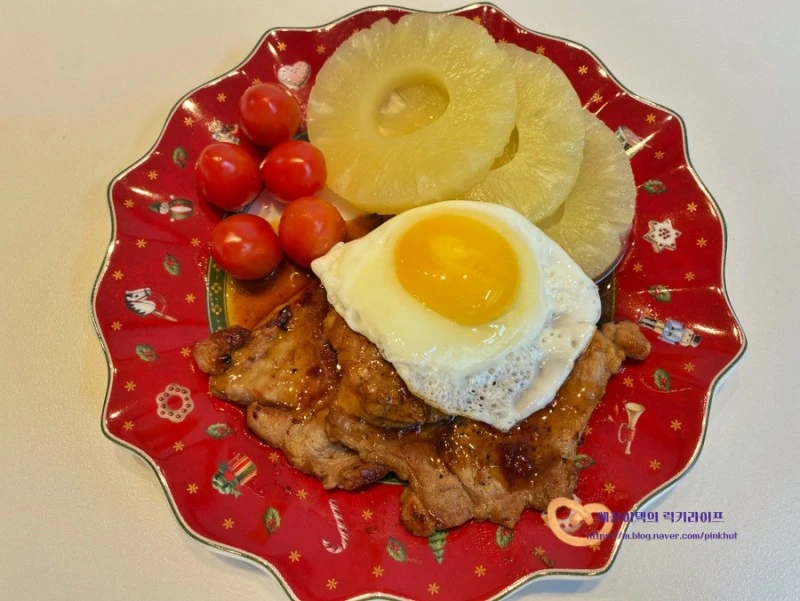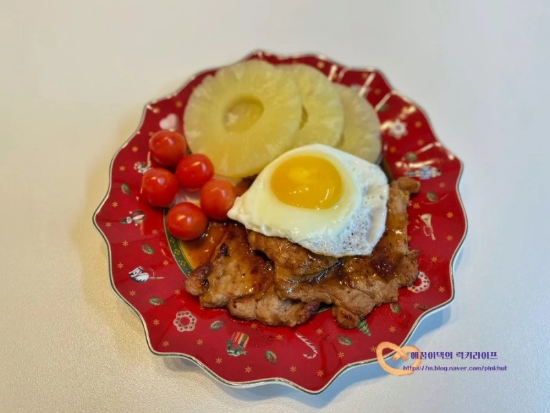 가니쉬로 계란후라이, 파인애플, 토마토 정도 준비해서