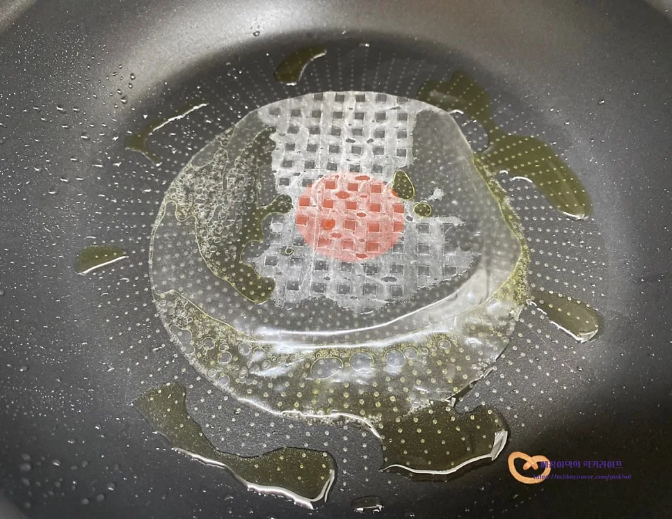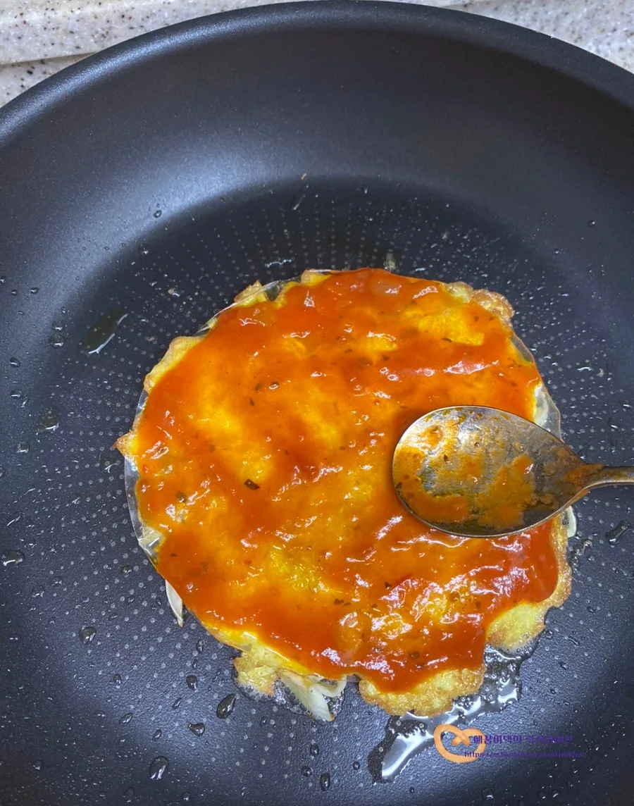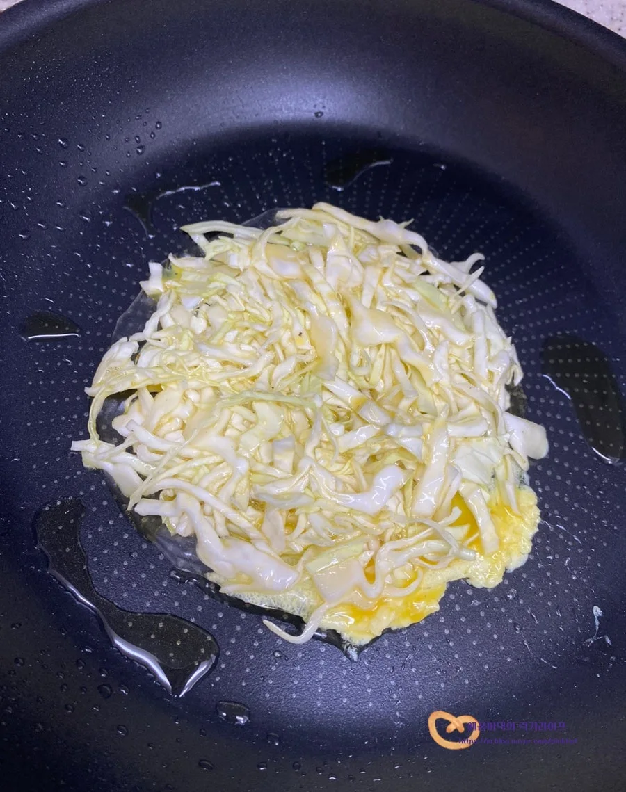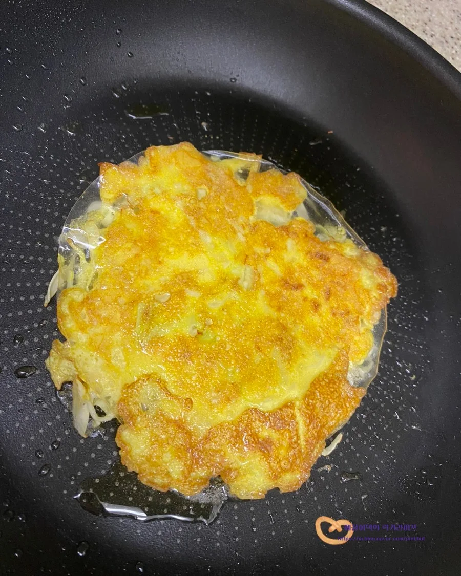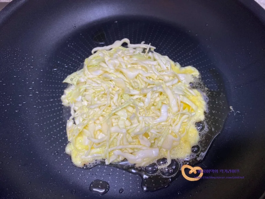 3. 팬에 라이스페이퍼- 양배추반죽 올려서 굽기