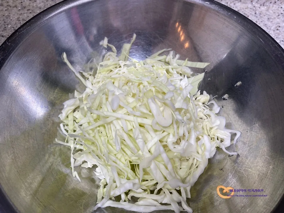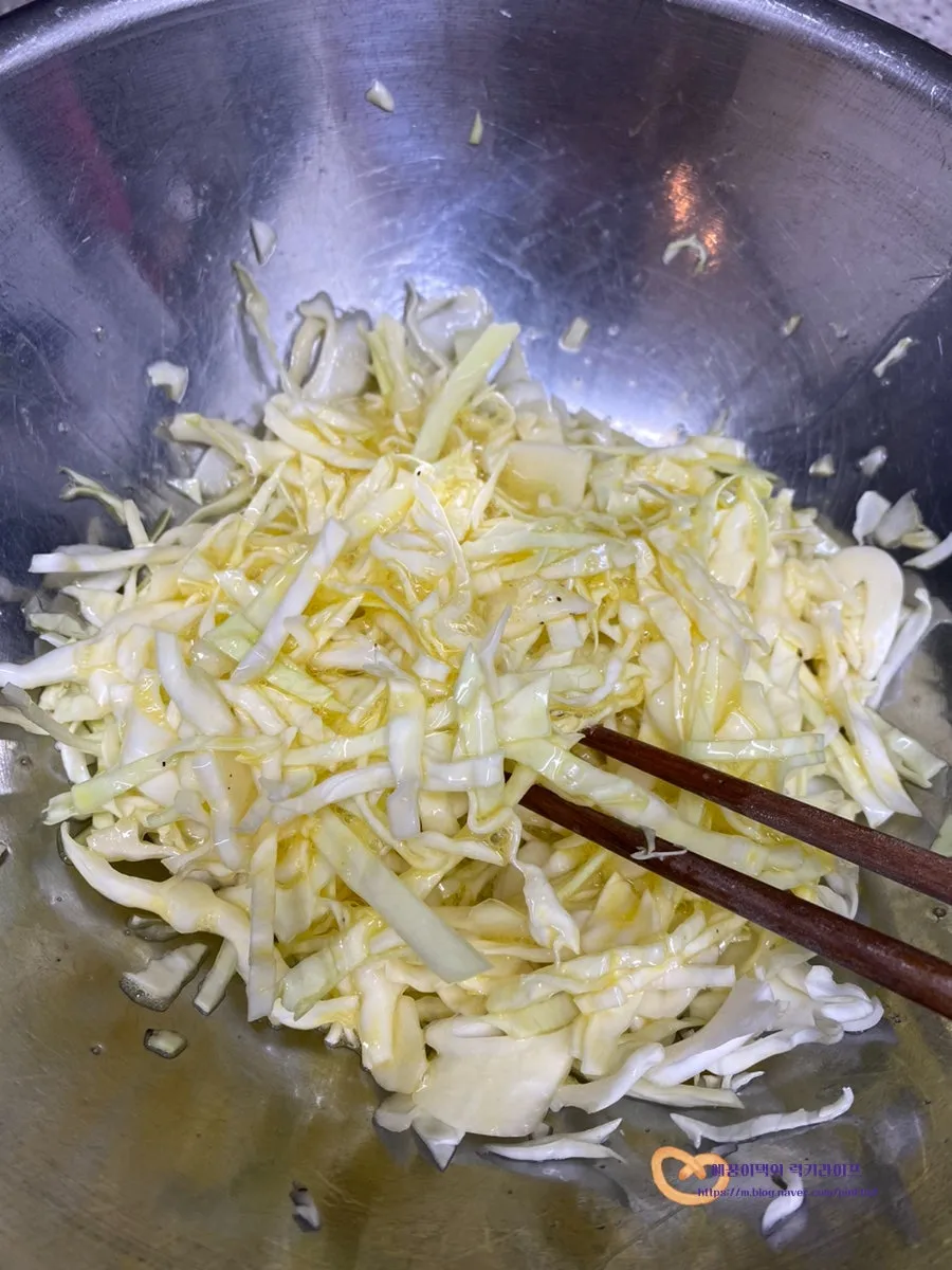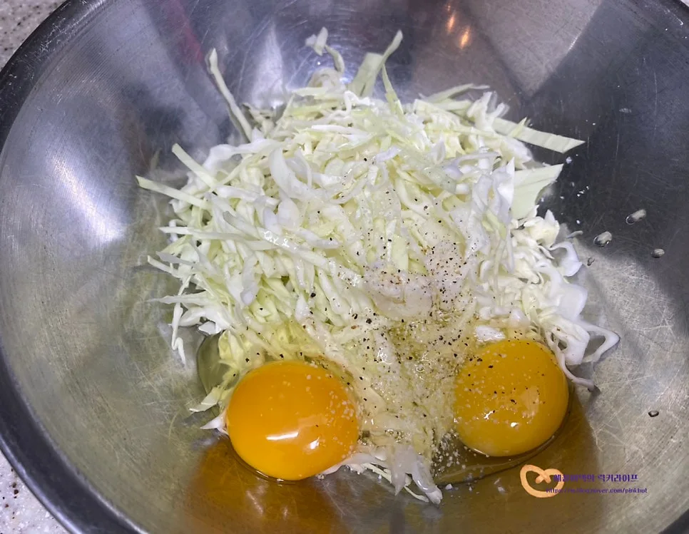 2. 볼에 양배추, 계란, 소금 넣고 반죽하기