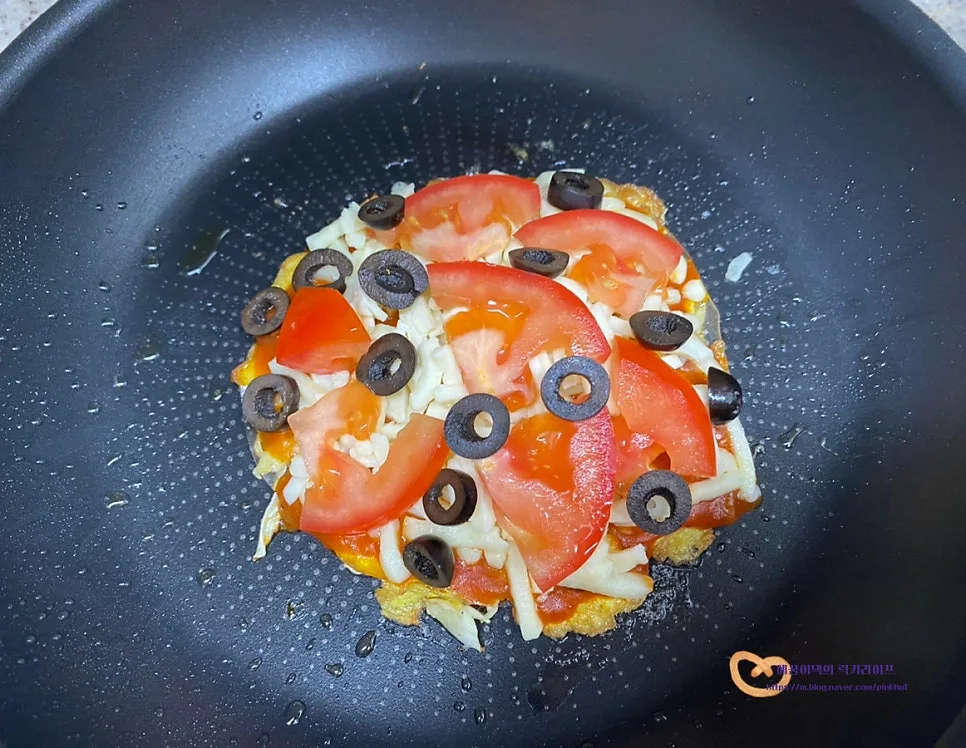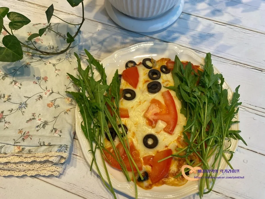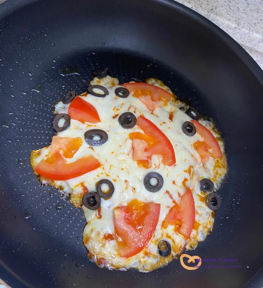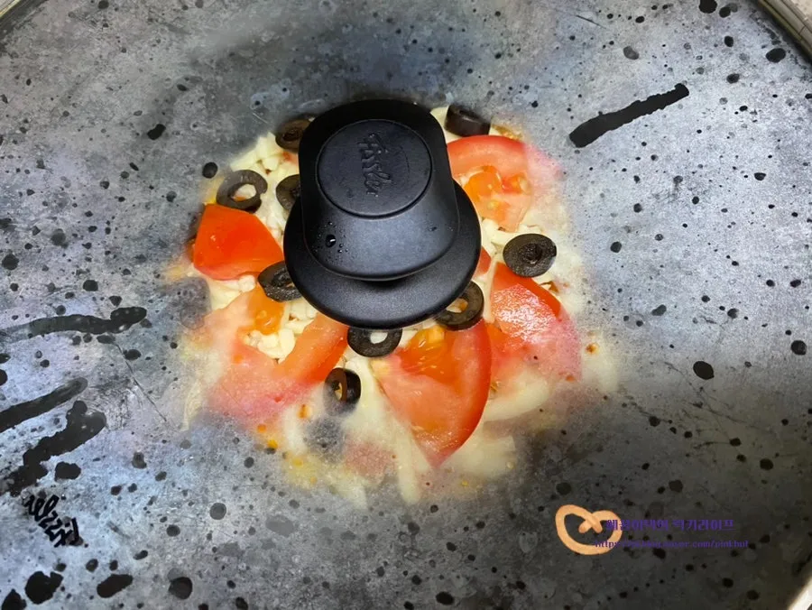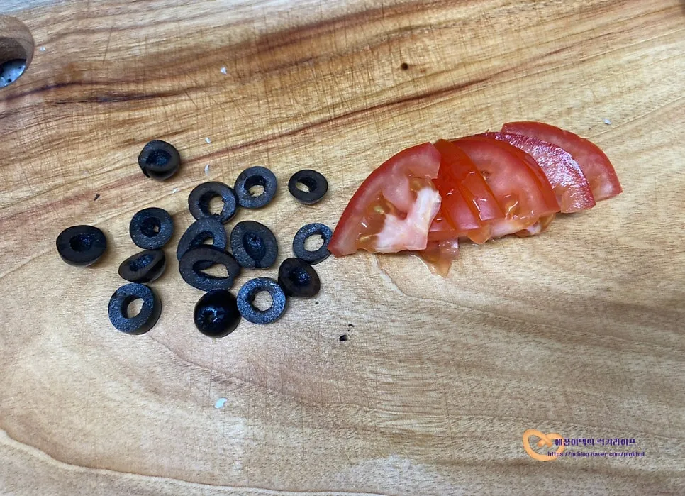 피자치즈 위에 생토마토와 올리브를 올려줍니다