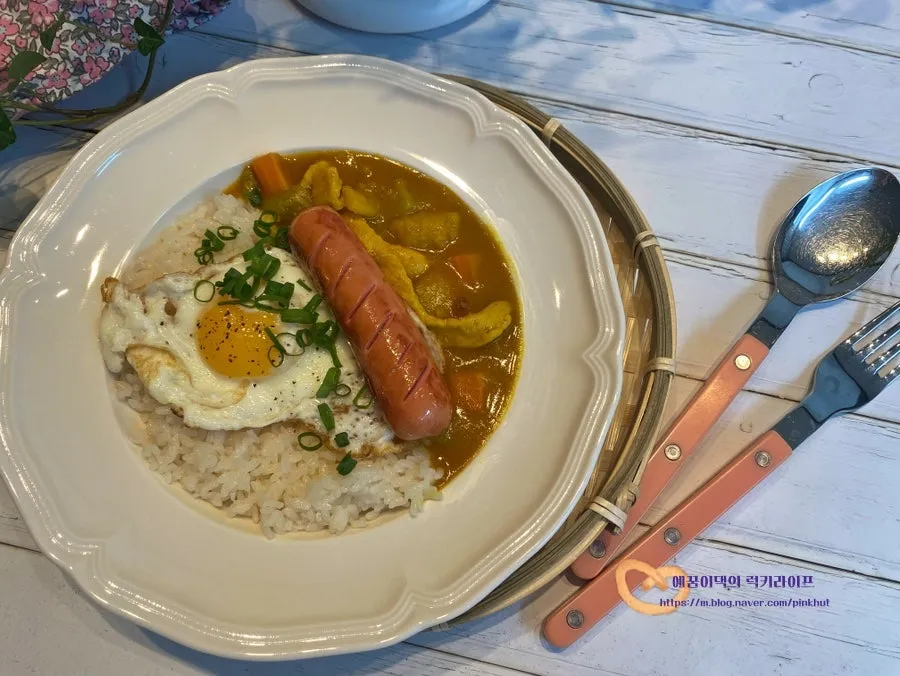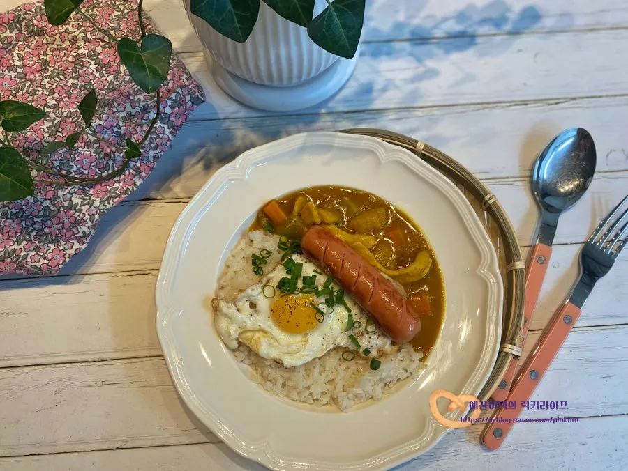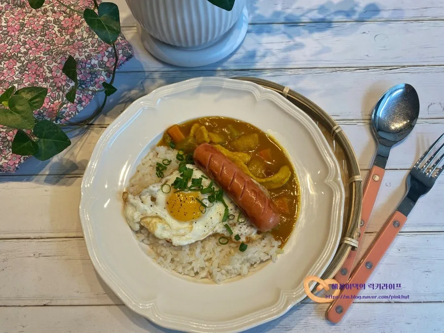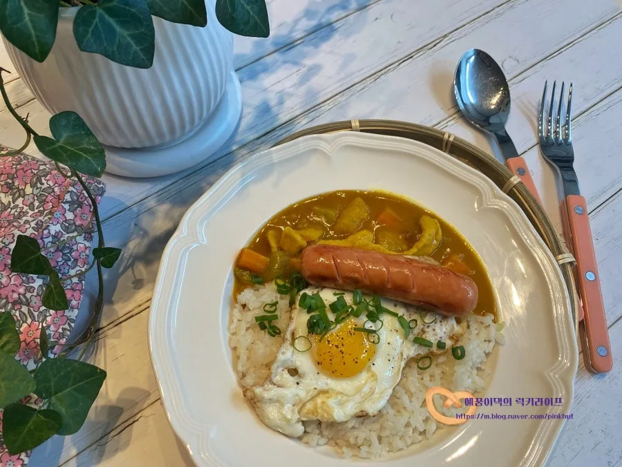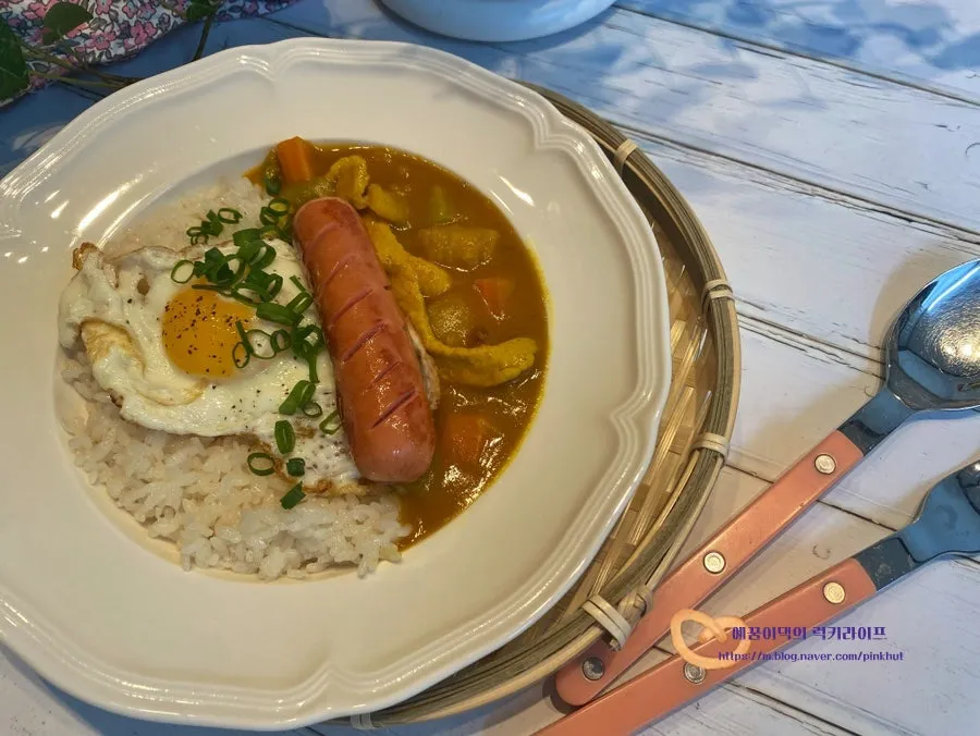 카레 맛있게 먹는 법으로 소세지와 계란후라이를