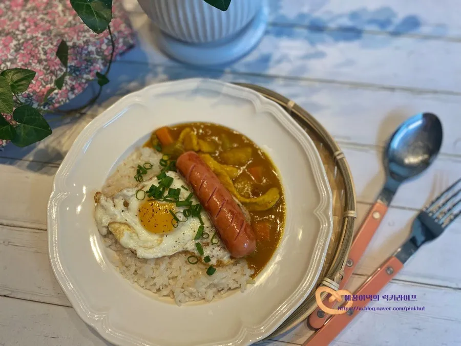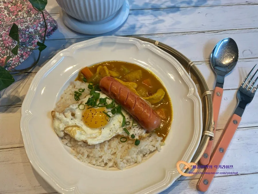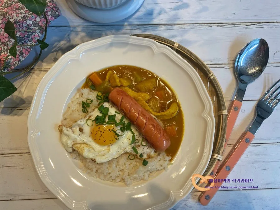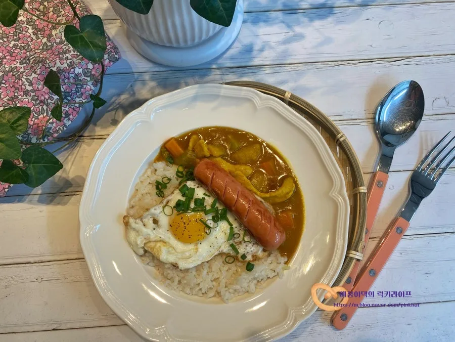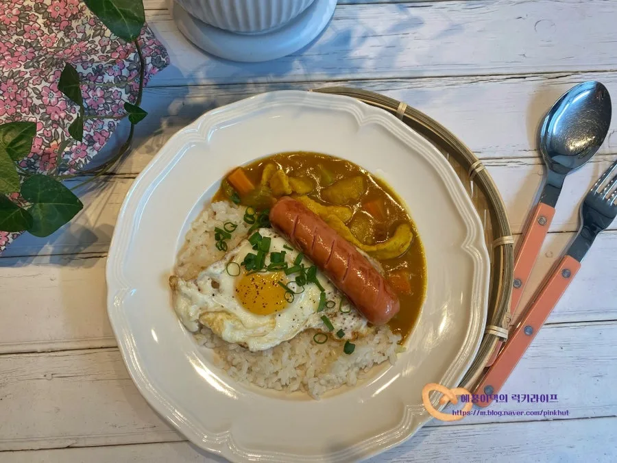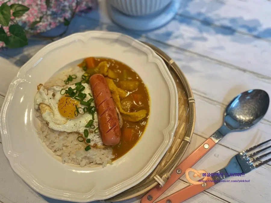 카레 맛있게 먹는 법으로 소세지와 계란후라이를