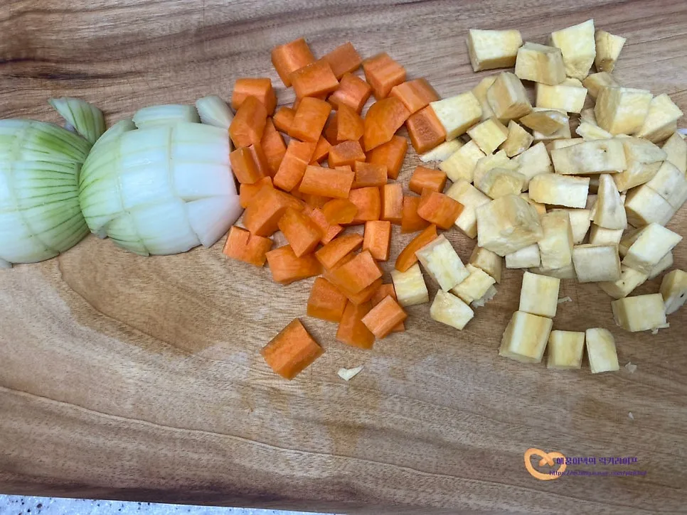 양파와 비슷한 사이즈로 깍둑썰기 해주었어요