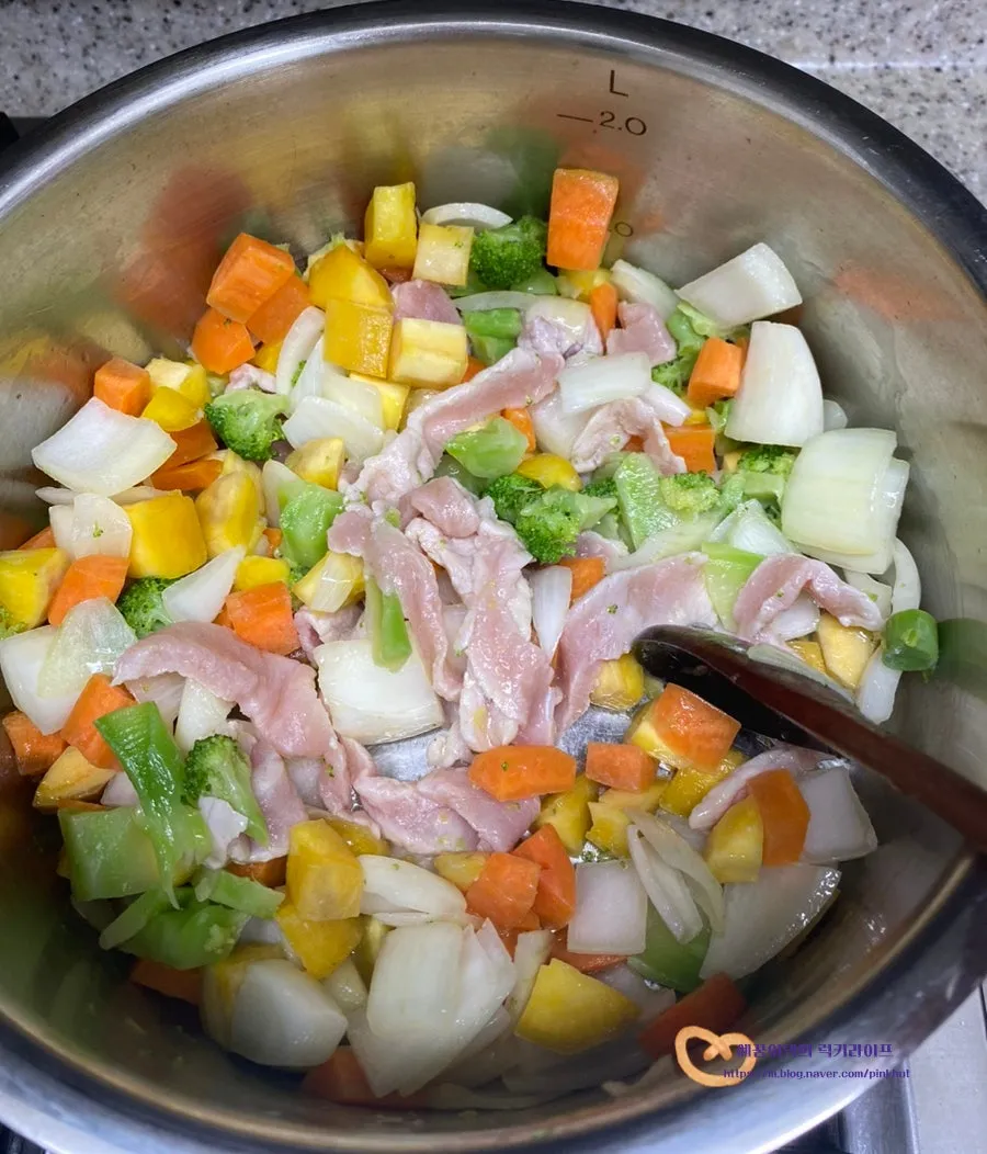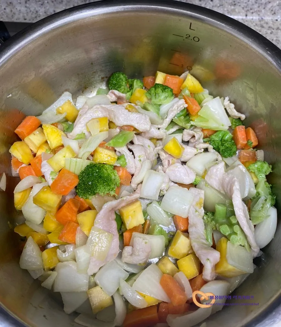 야채와 고기가 잘 익었으면 약불로 줄이고