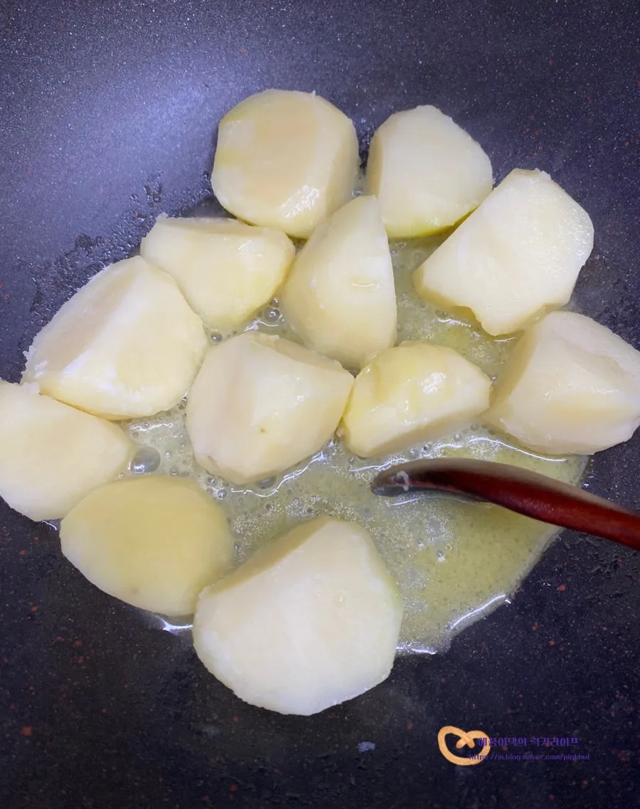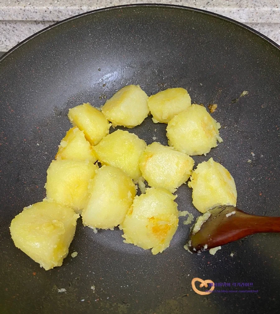 예열한 팬에 감자를 넣어주는데요.