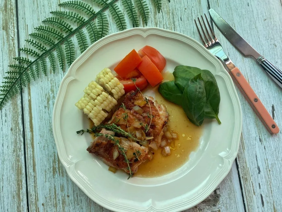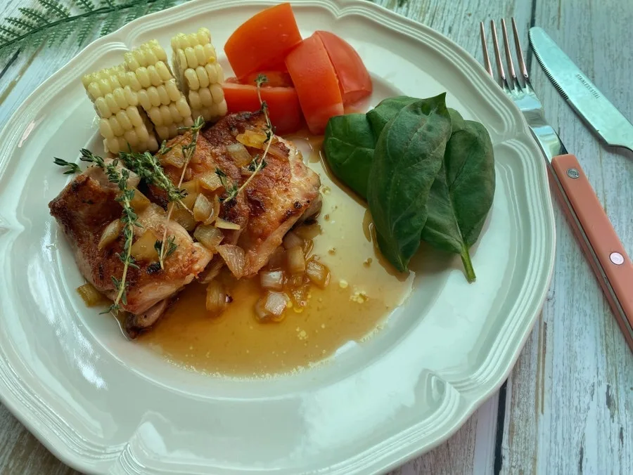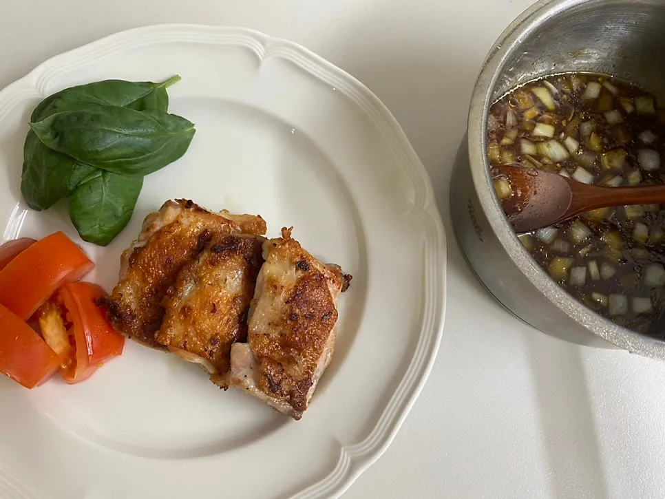 맛있게 구워진 치킨스테이크를 접시에 올리고