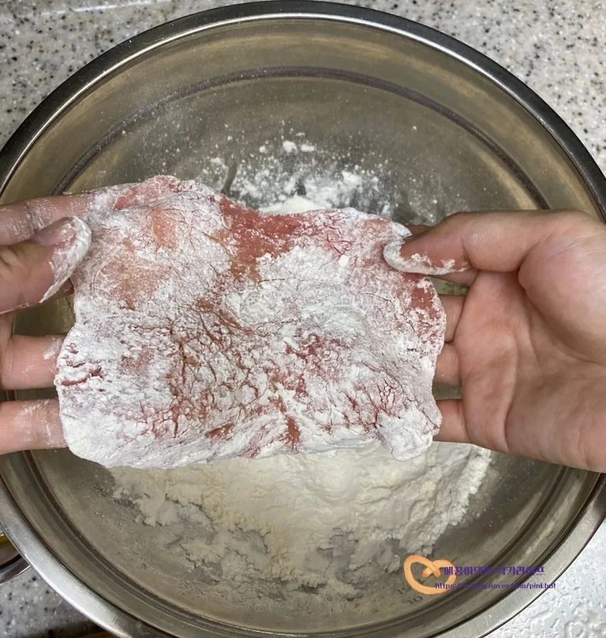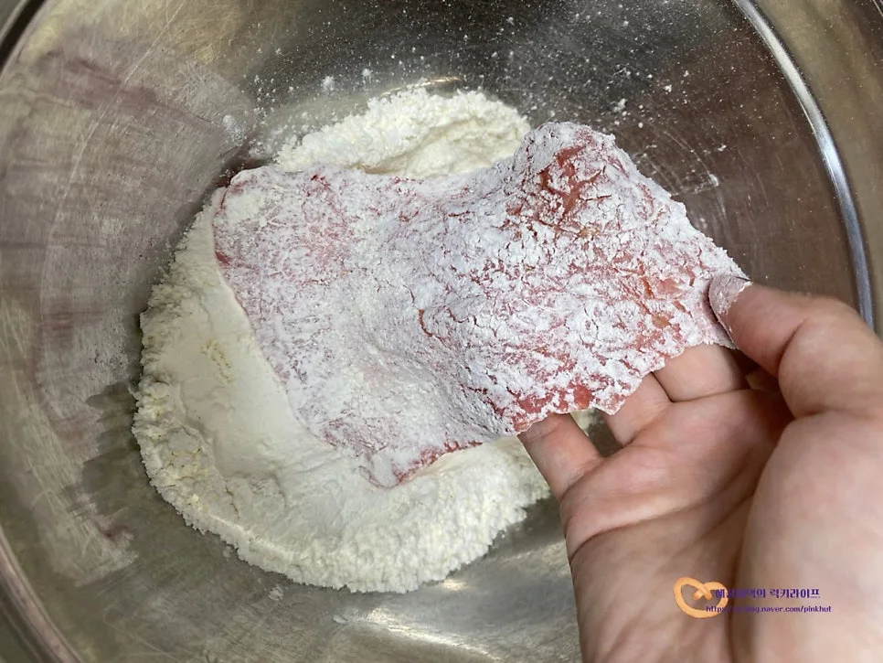 부침가루를 앞뒤로 꼼꼼히 입혀주세요