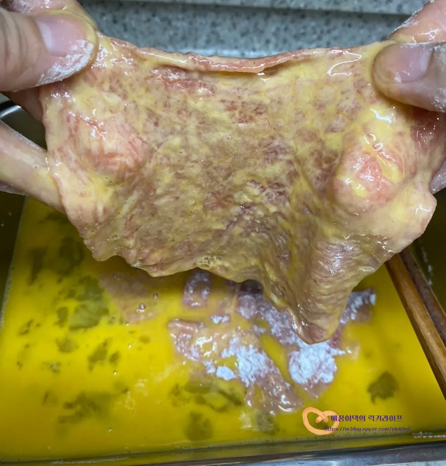 만들어 놓은 육전소스를 고기에 펴서 발라줍니다