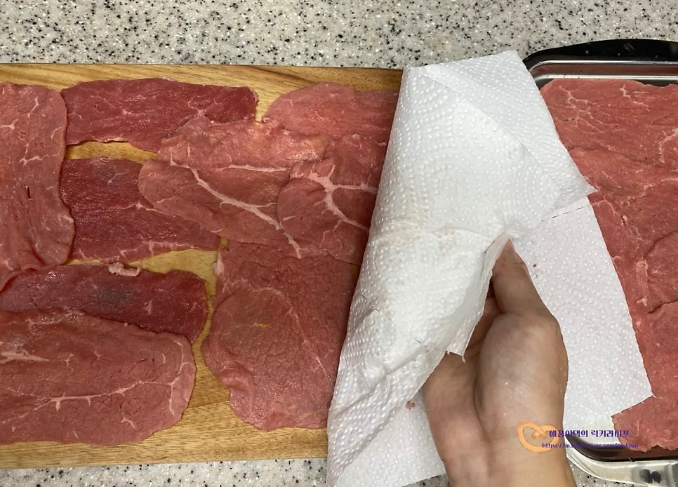 키친타올로 꾹꾹 눌러 핏물을 제거해 주세요 :)