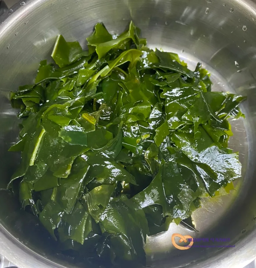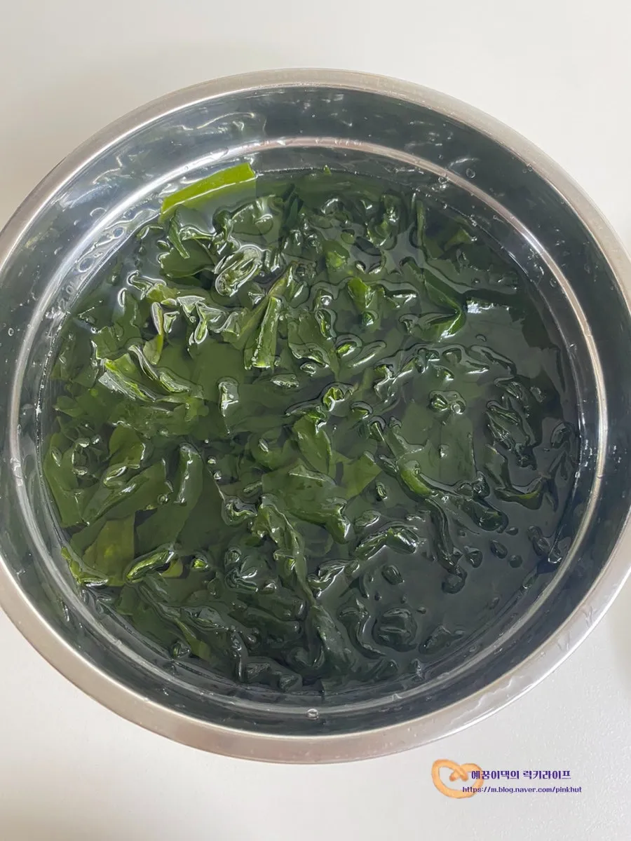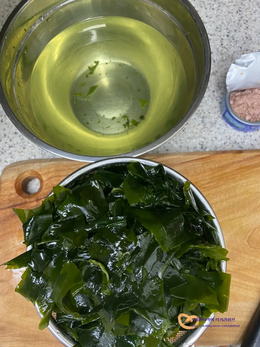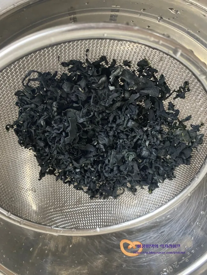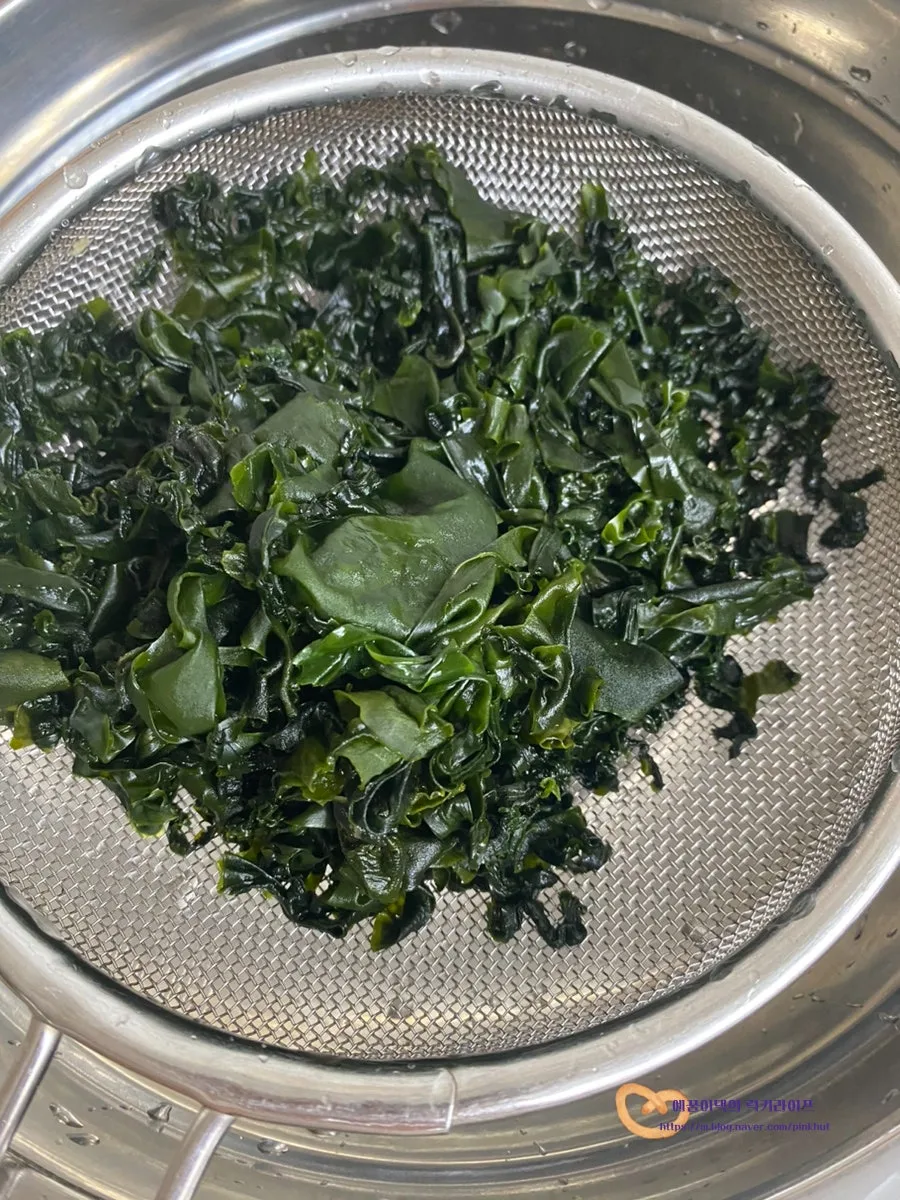 촉촉하게 불린 미역은 채반에 밭쳐서