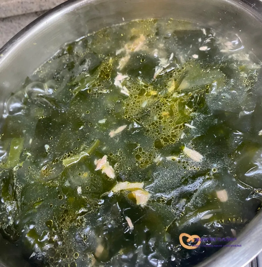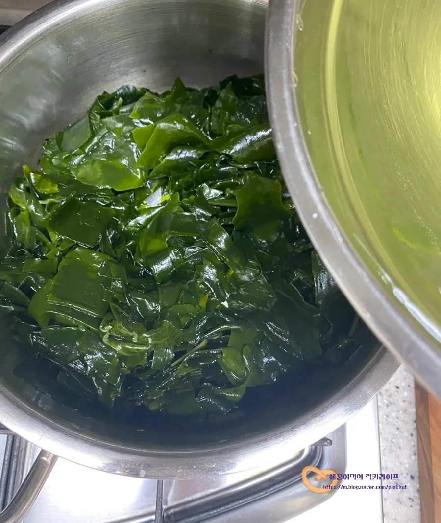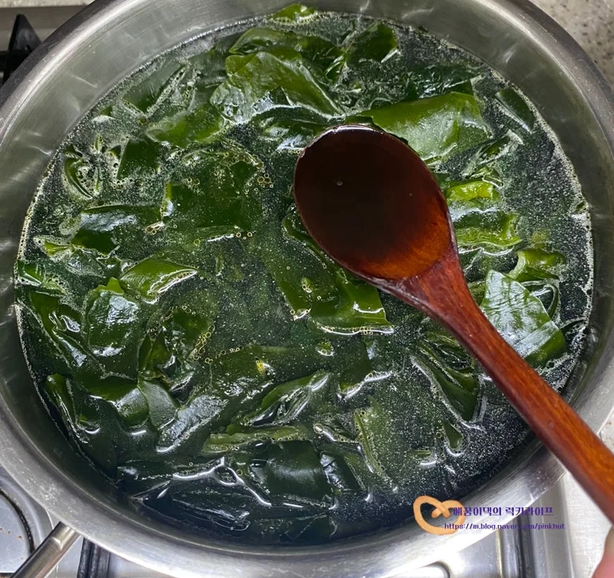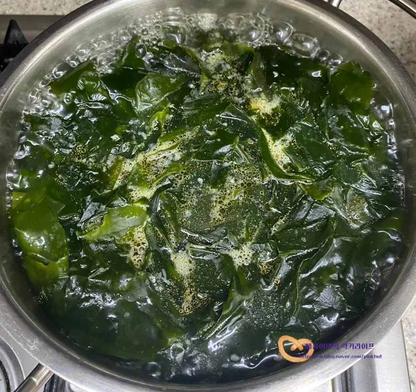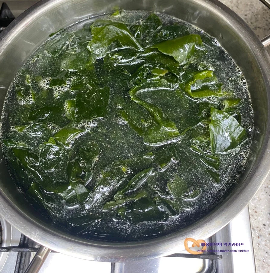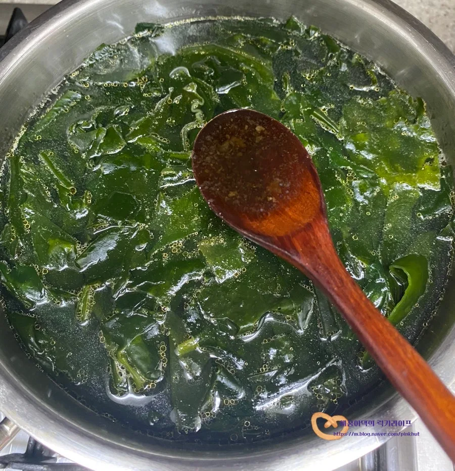 3. 미역 불린 물, 양념재료 넣고 끓이기