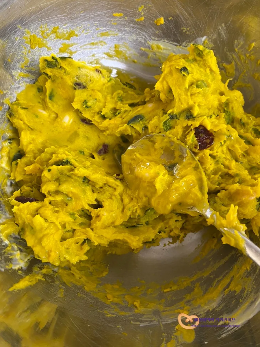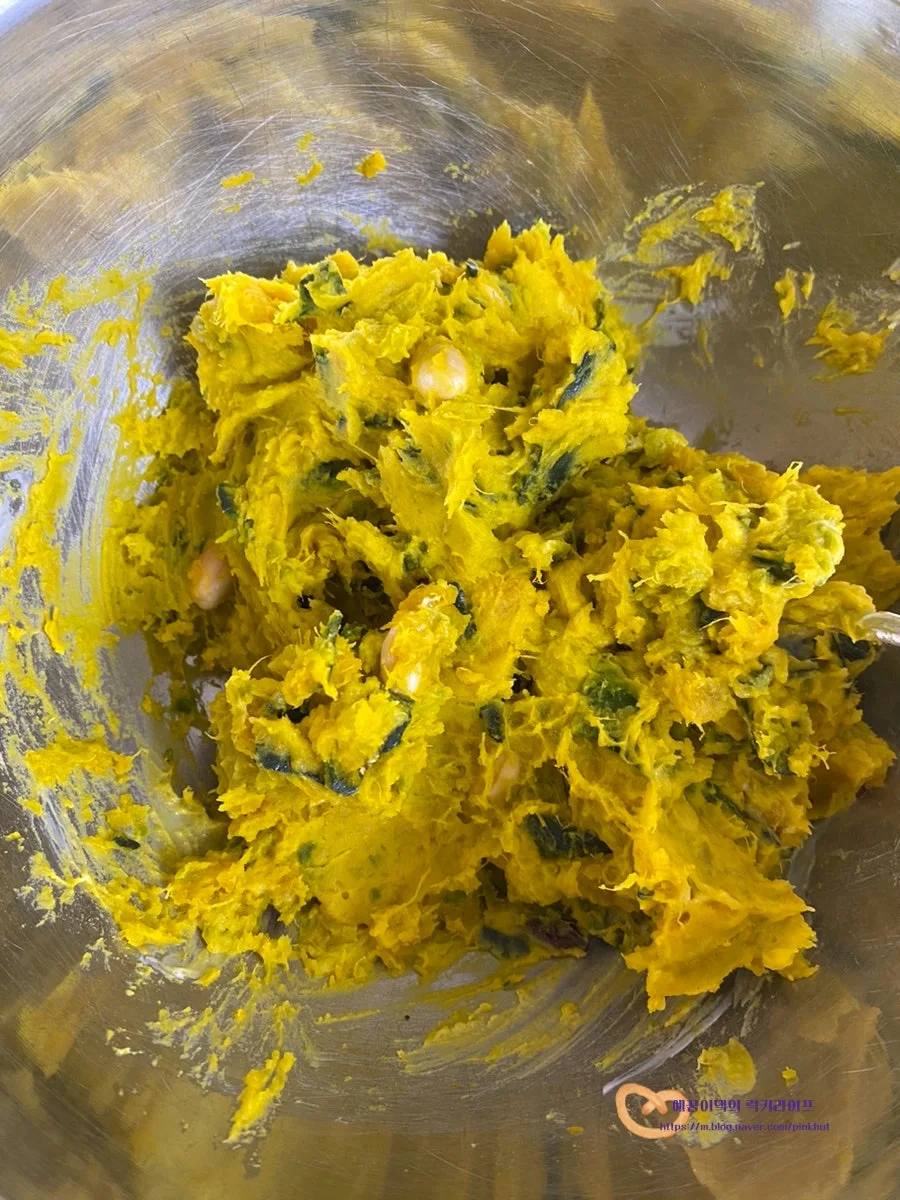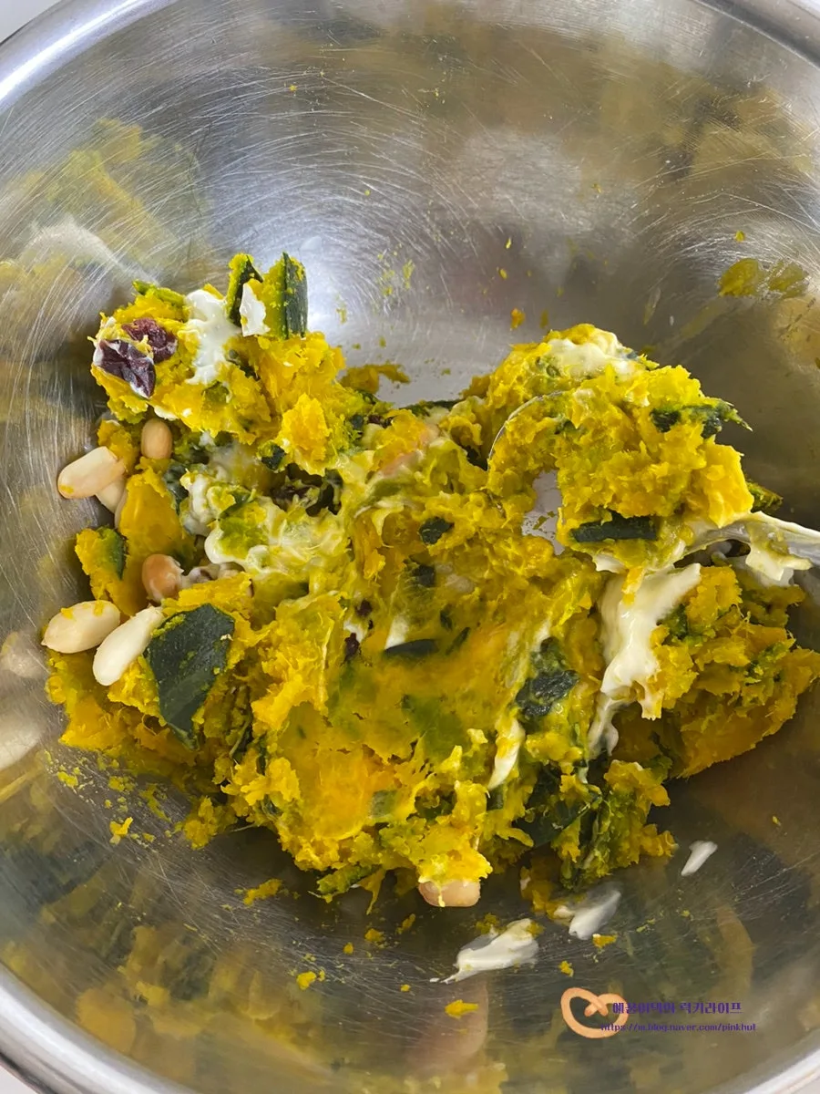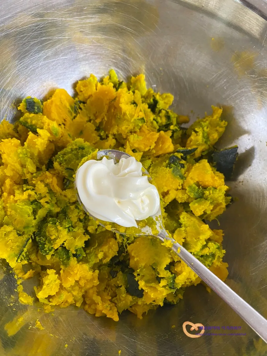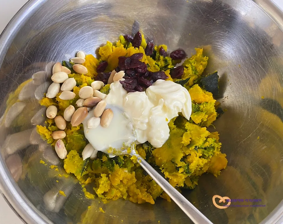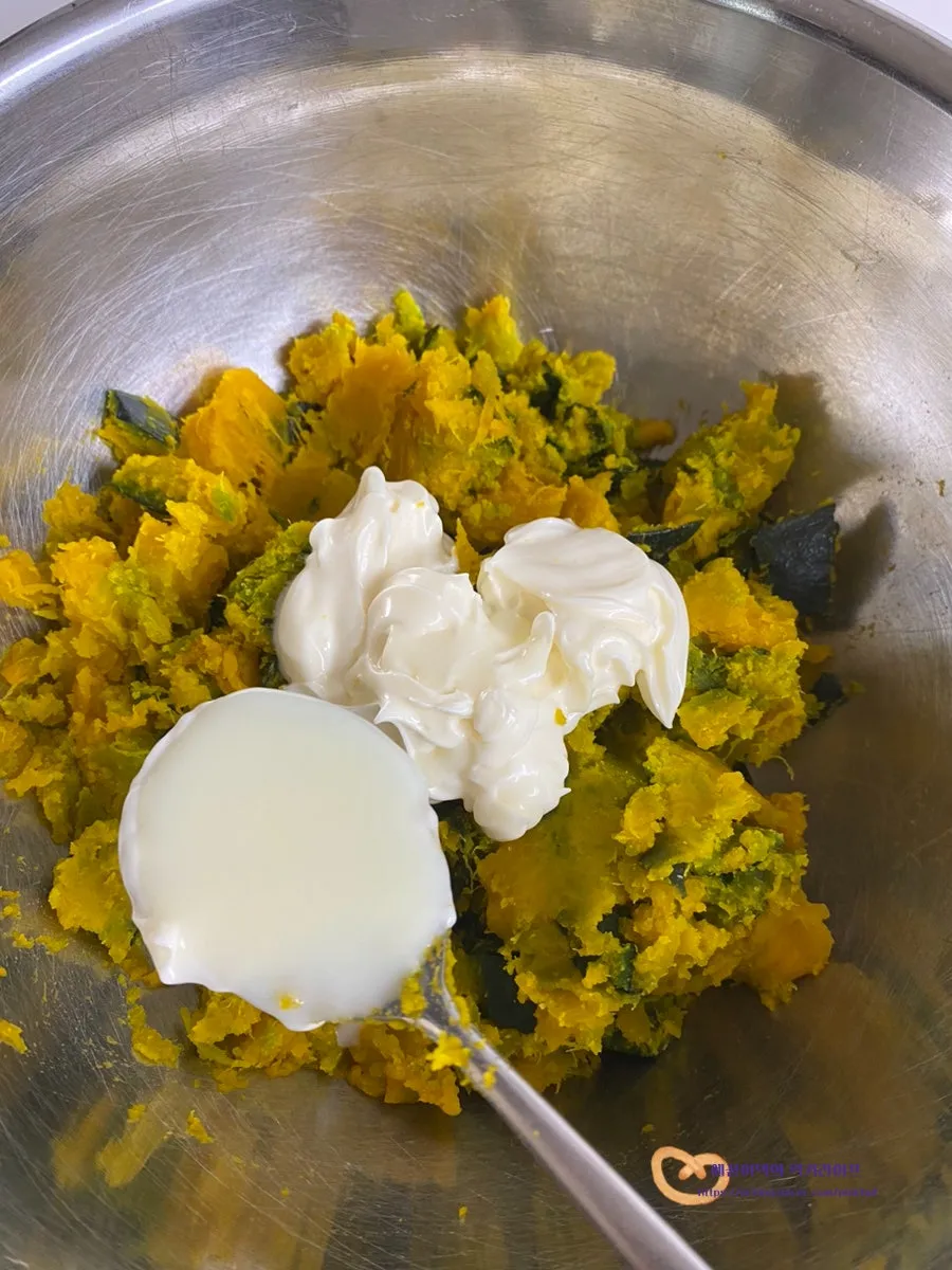 단호박 샐러드에 연유를 넣어주면