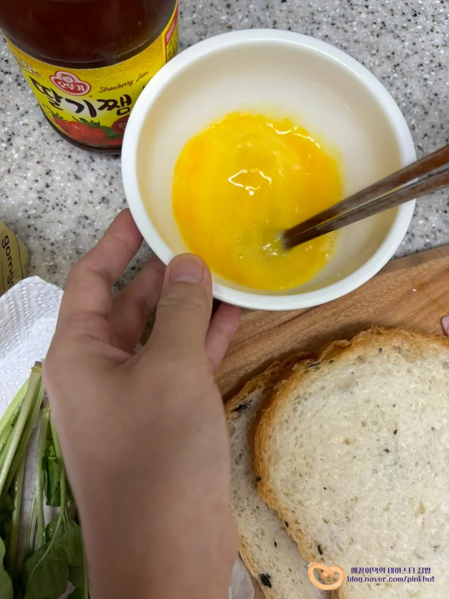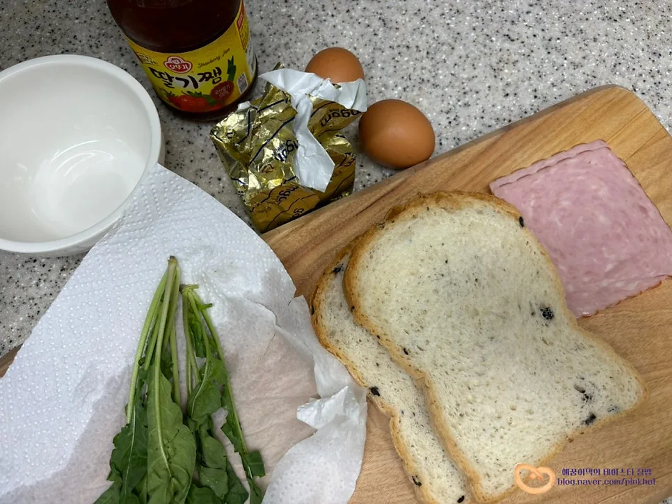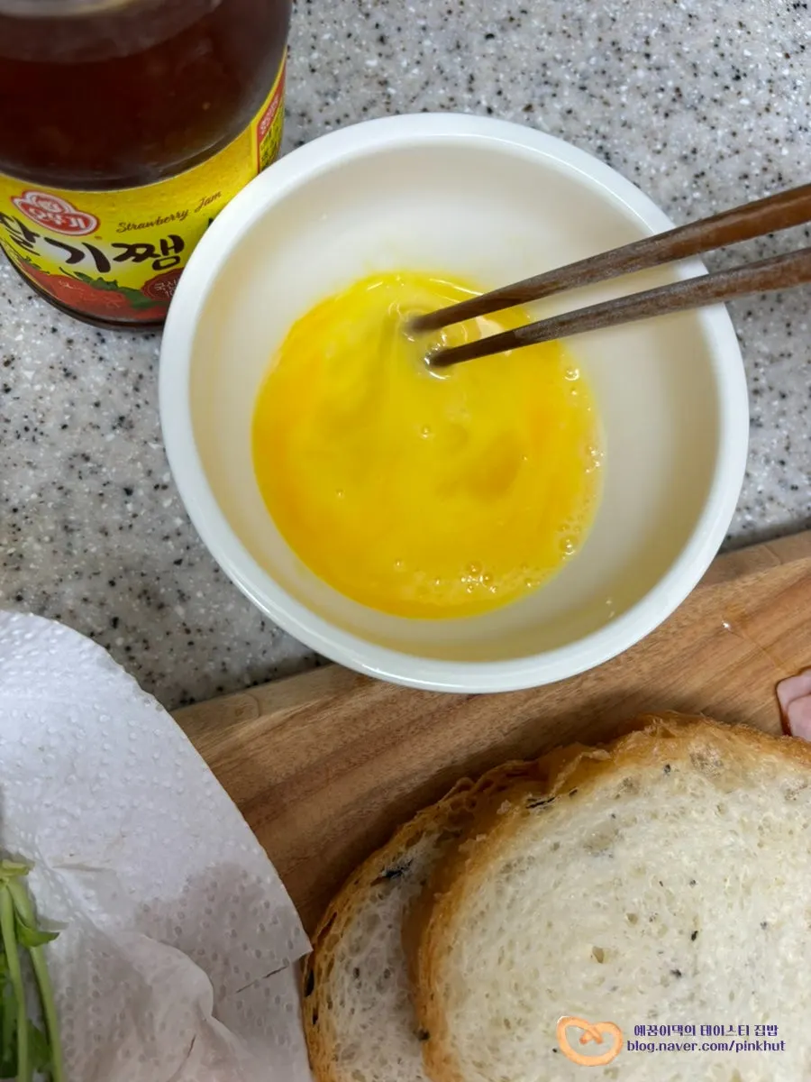 계란 2개, 슬라이스햄 2장, 딸기잼 2T를