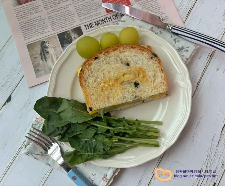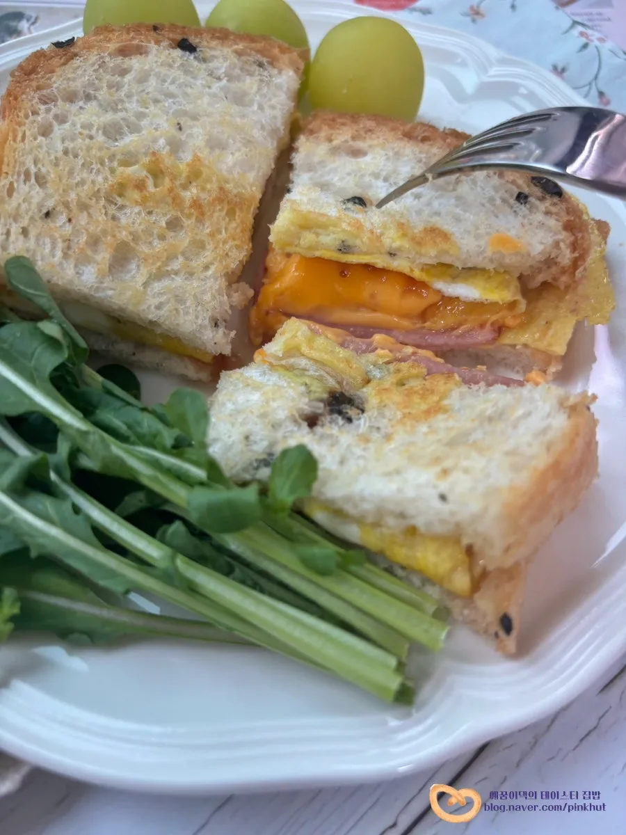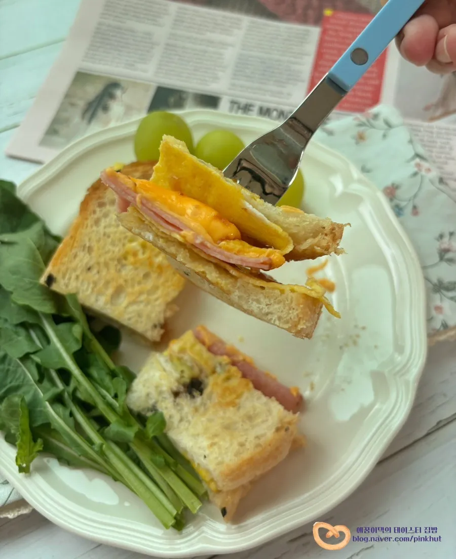 맛있게 구워진 햄치즈토스트를 접시에 담고