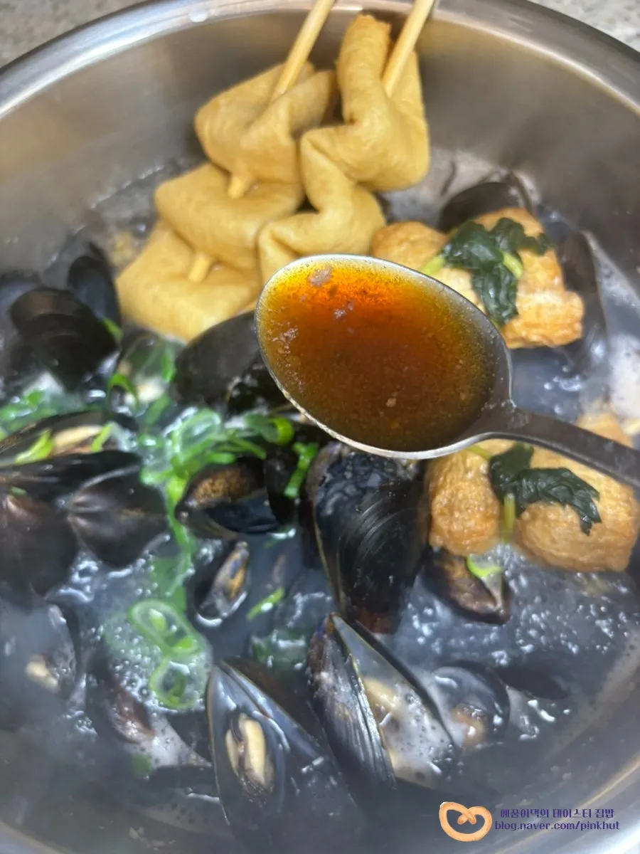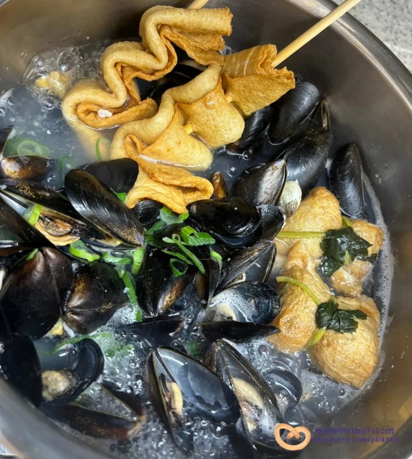 맛있게 끓여진 홍합과 국물, 어묵꼬치,