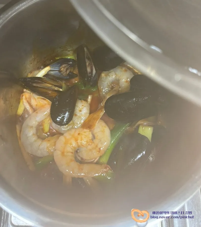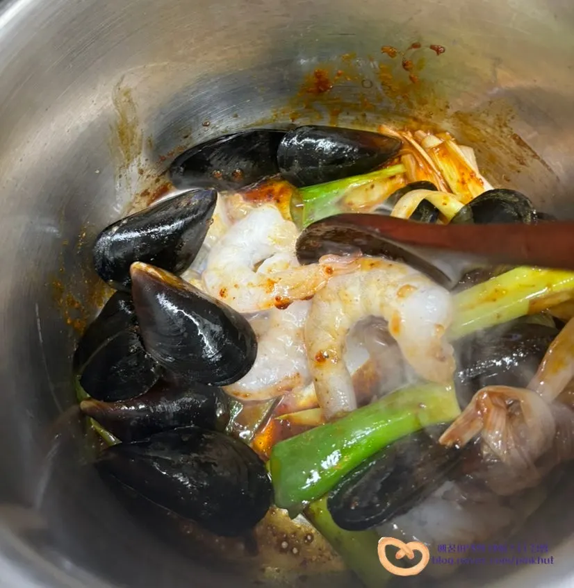 더하고 홍합, 새우를 넣어주면 국물맛이