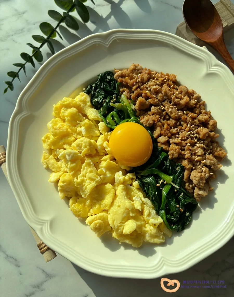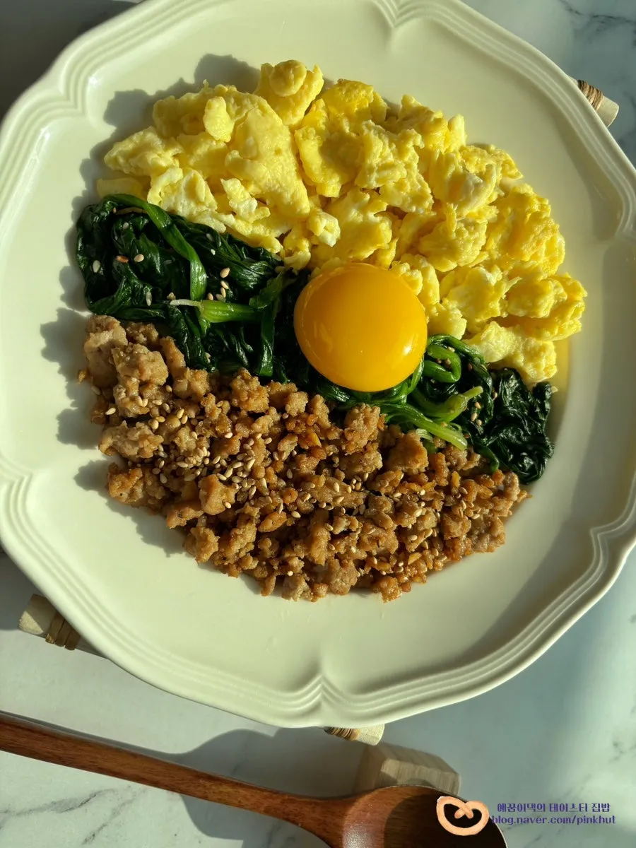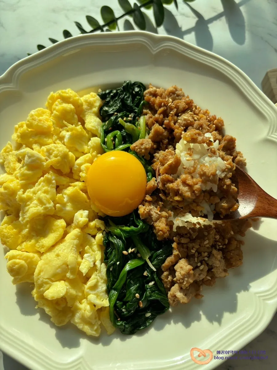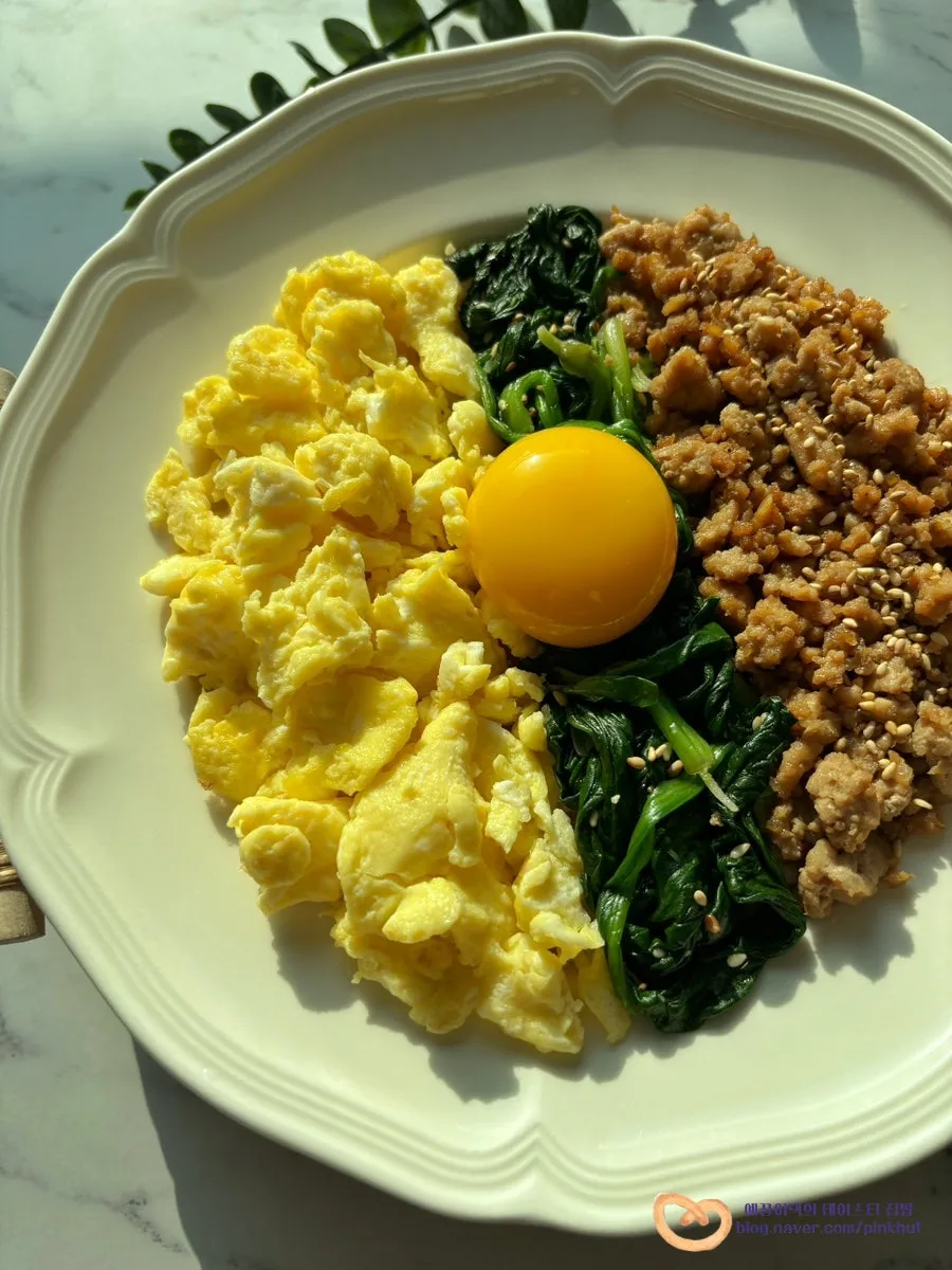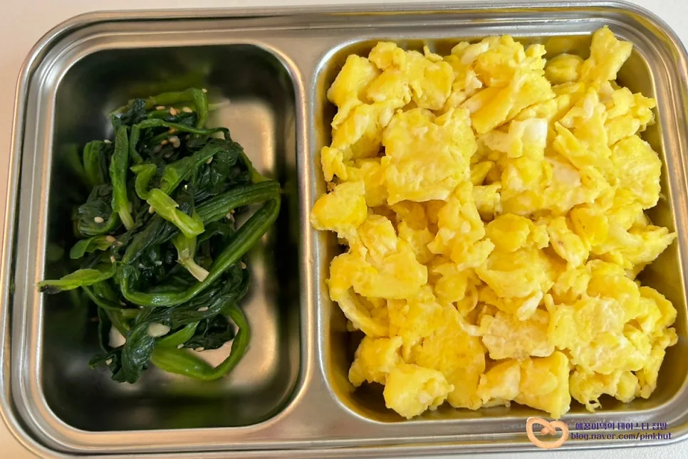 노랑- 계란 스크램블, 초록- 시금치나물무침,