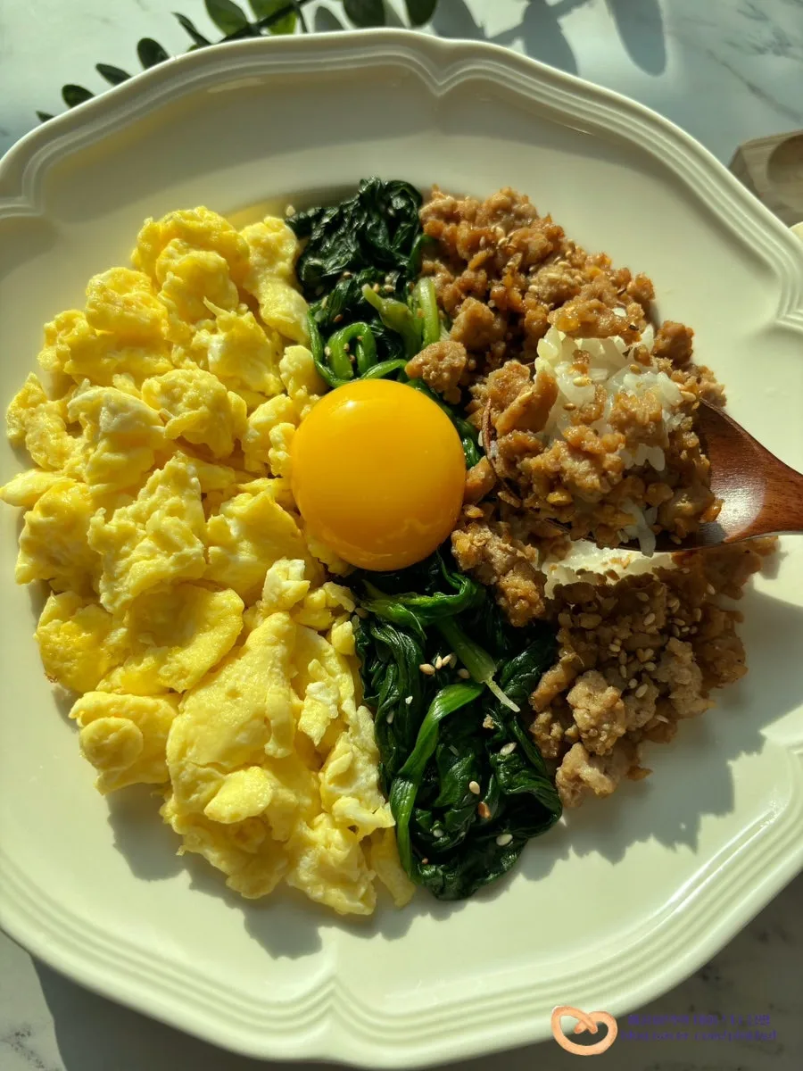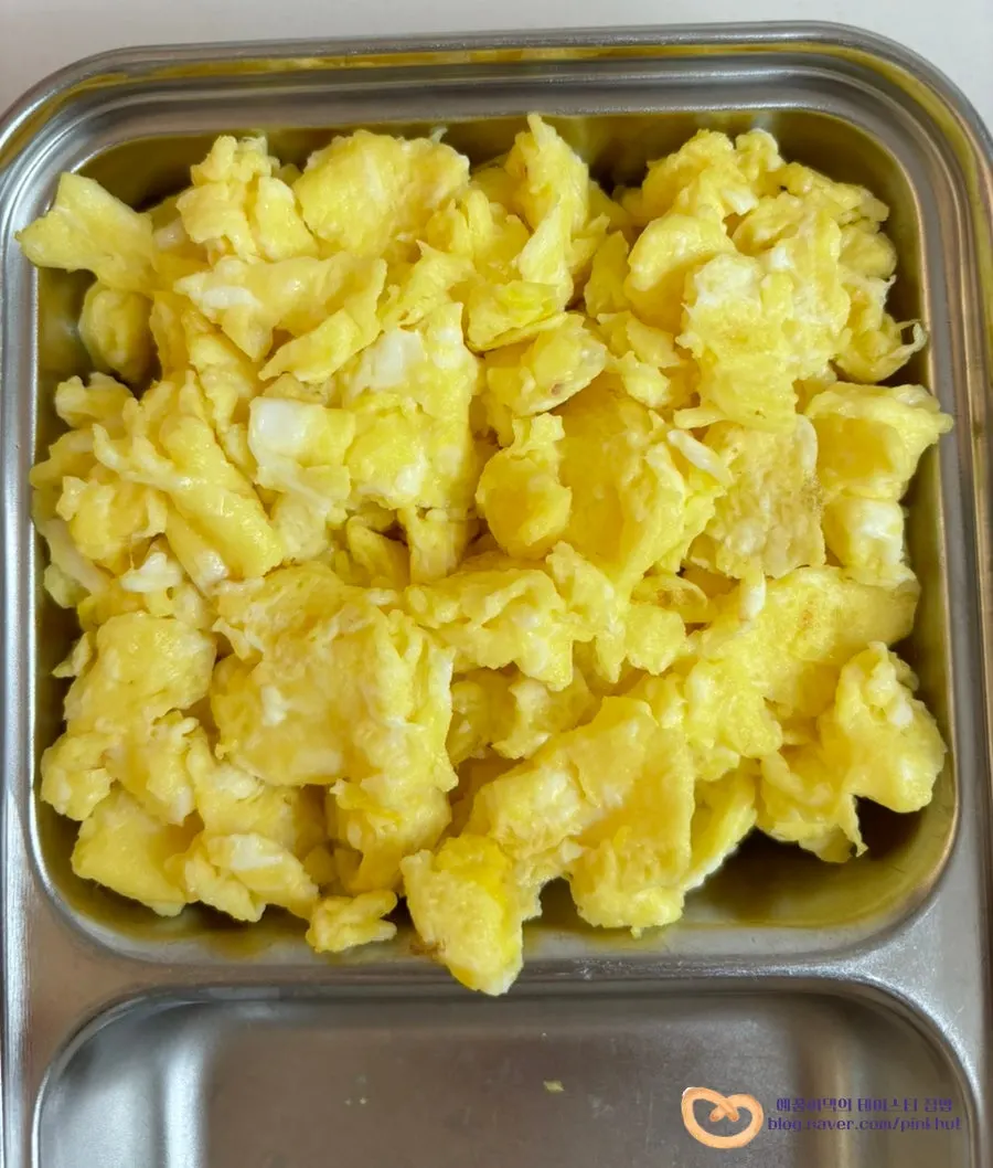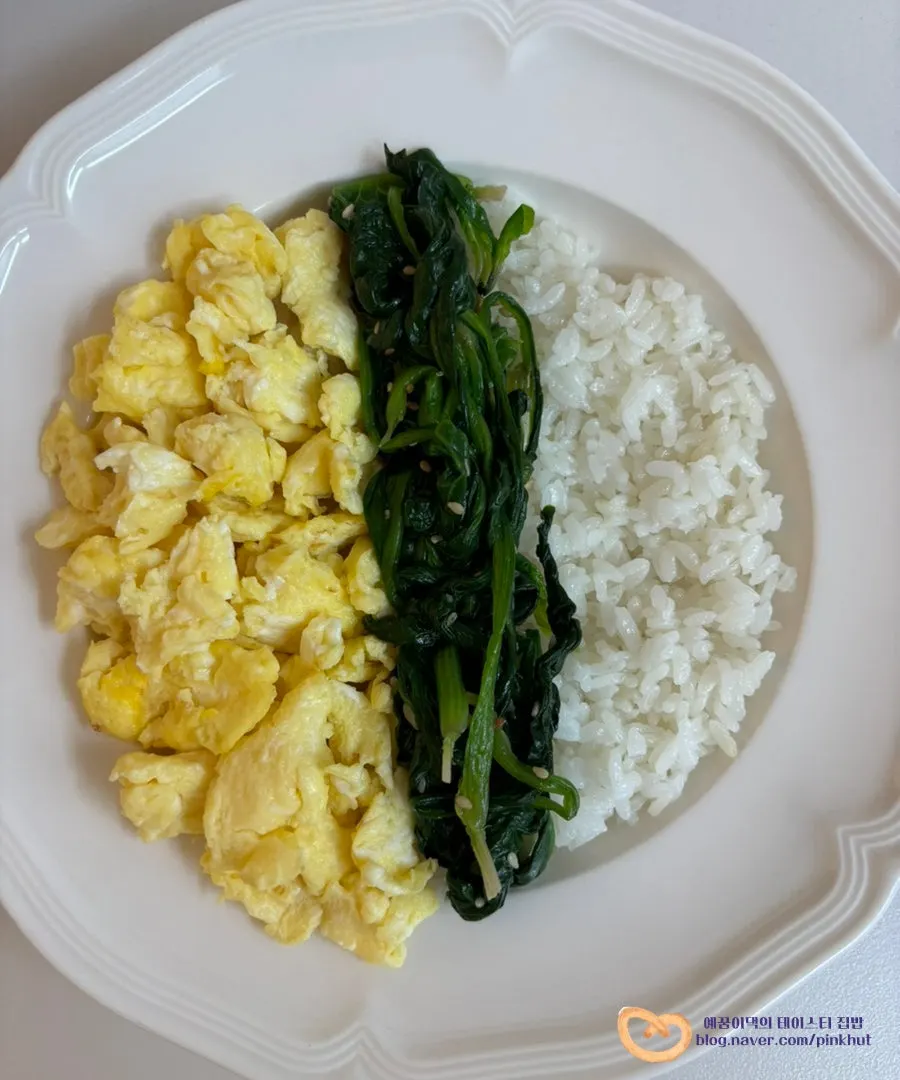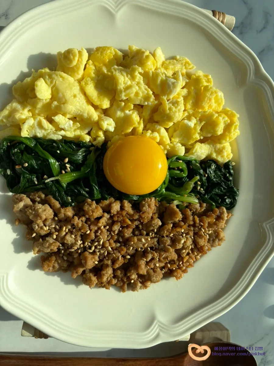 노랑- 계란 스크램블, 초록- 시금치나물무침,