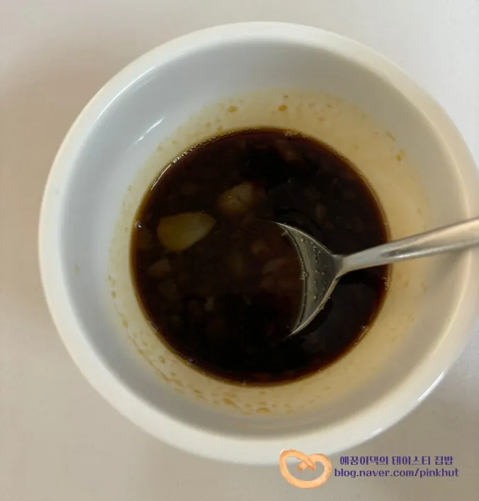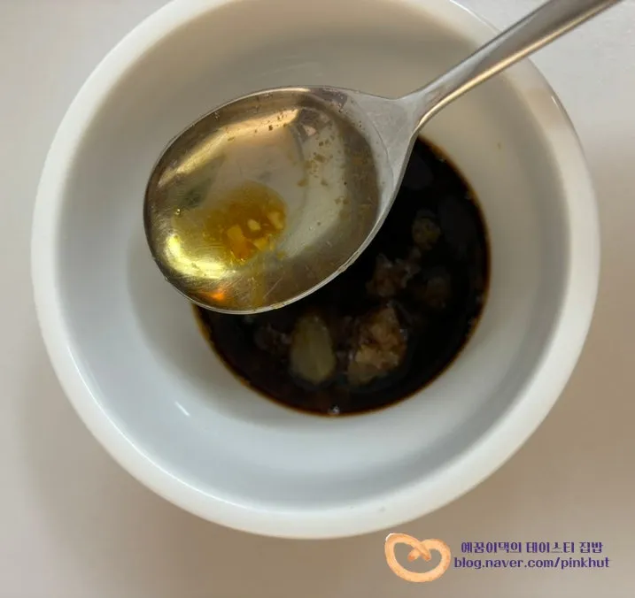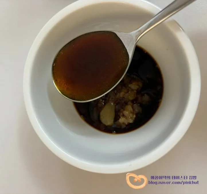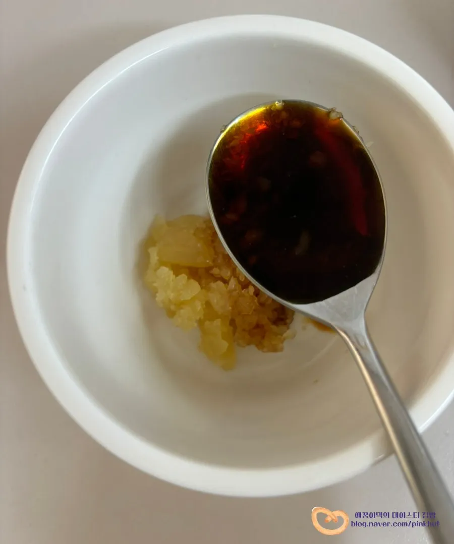 볼에 다진마늘 1T, 진간장 4T, 참치액 1T,